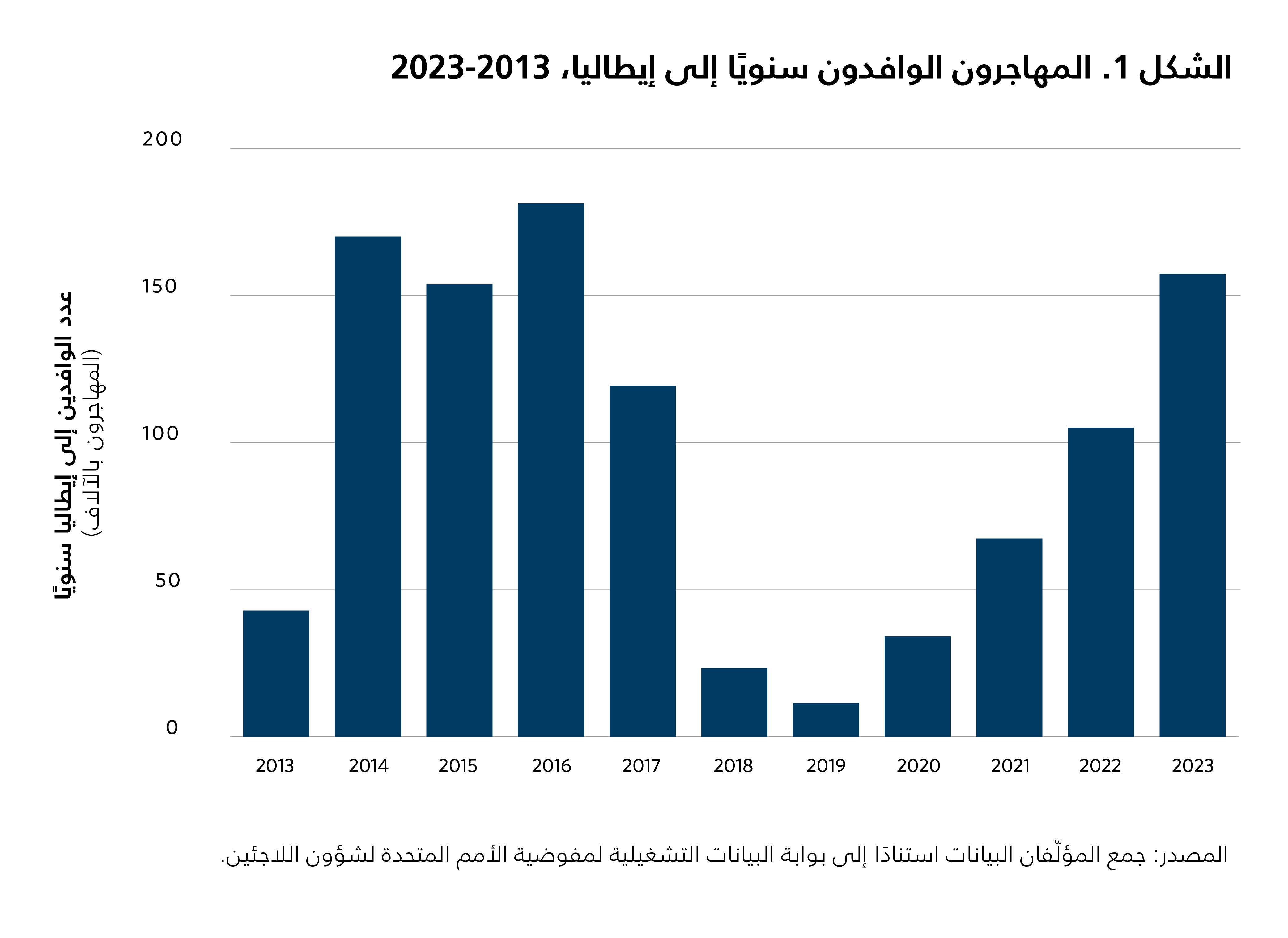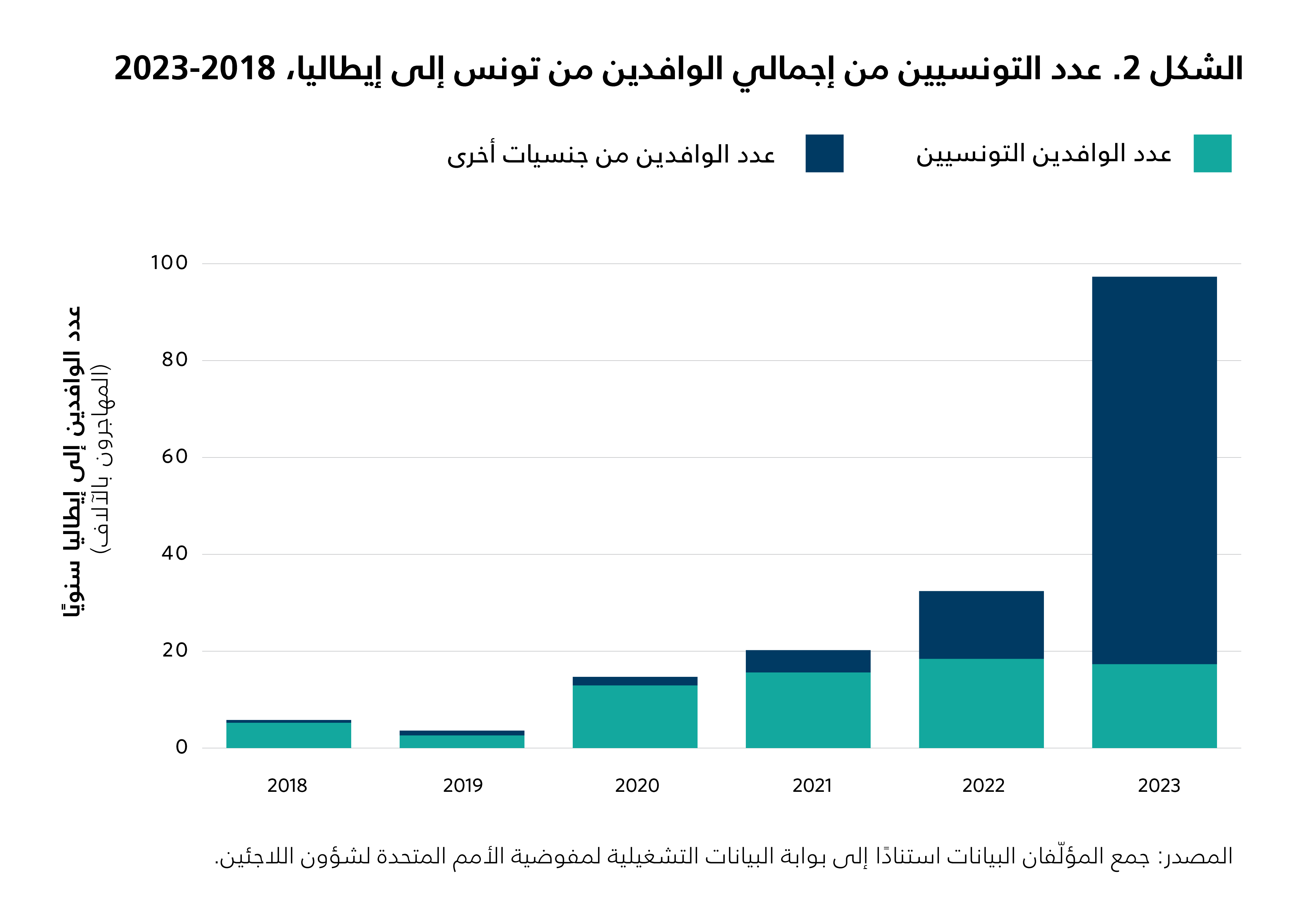 بحسب الأرقام، كانت ليبيا في العام 2017، أي قُبيل توقيع اتفاق الهجرة المتمحور حول الأمن بين ليبيا وإيطاليا، نقطة عبور 91 في المئة من الوافدين إلى الشواطئ الإيطالية، فشكّلت بذلك الوجهة الأساسية لمعظم المهاجرين الأفارقة. لكن تونس أصبحت نقطة عبور مفضّلة للمهاجرين على طول الطريق المركزي للبحر المتوسط. بحلول العام 2019، غادر 36 في المئة فقط من المهاجرين بحرًا من ليبيا، وانطلق 32 في المئة من تونس. أما في العام 2020، فقد وصل إلى إيطاليا 43 في المئة من الوافدين بحرًا من تونس، و38 في المئة من ليبيا.24 واستمرّ هذا المنحى ليسجّل أعلى مستوياته في العام 2023، حين بلغت نسبة الوافدين إلى الشواطئ الإيطالية 61 في المئة من تونس و33 في المئة من ليبيا.25 وارتفعت أيضًا الأرقام الإجمالية. وأدّى تدهور الأوضاع الاقتصادي في شمال أفريقيا ومنطقة الساحل بسبب تفشّي جائحة كوفيد-19 إلى زيادة حادّة في إجمالي عدد المهاجرين الوافدين إلى إيطاليا، من 11,500 في العام 2019 إلى 157,300 في العام 2023 .26