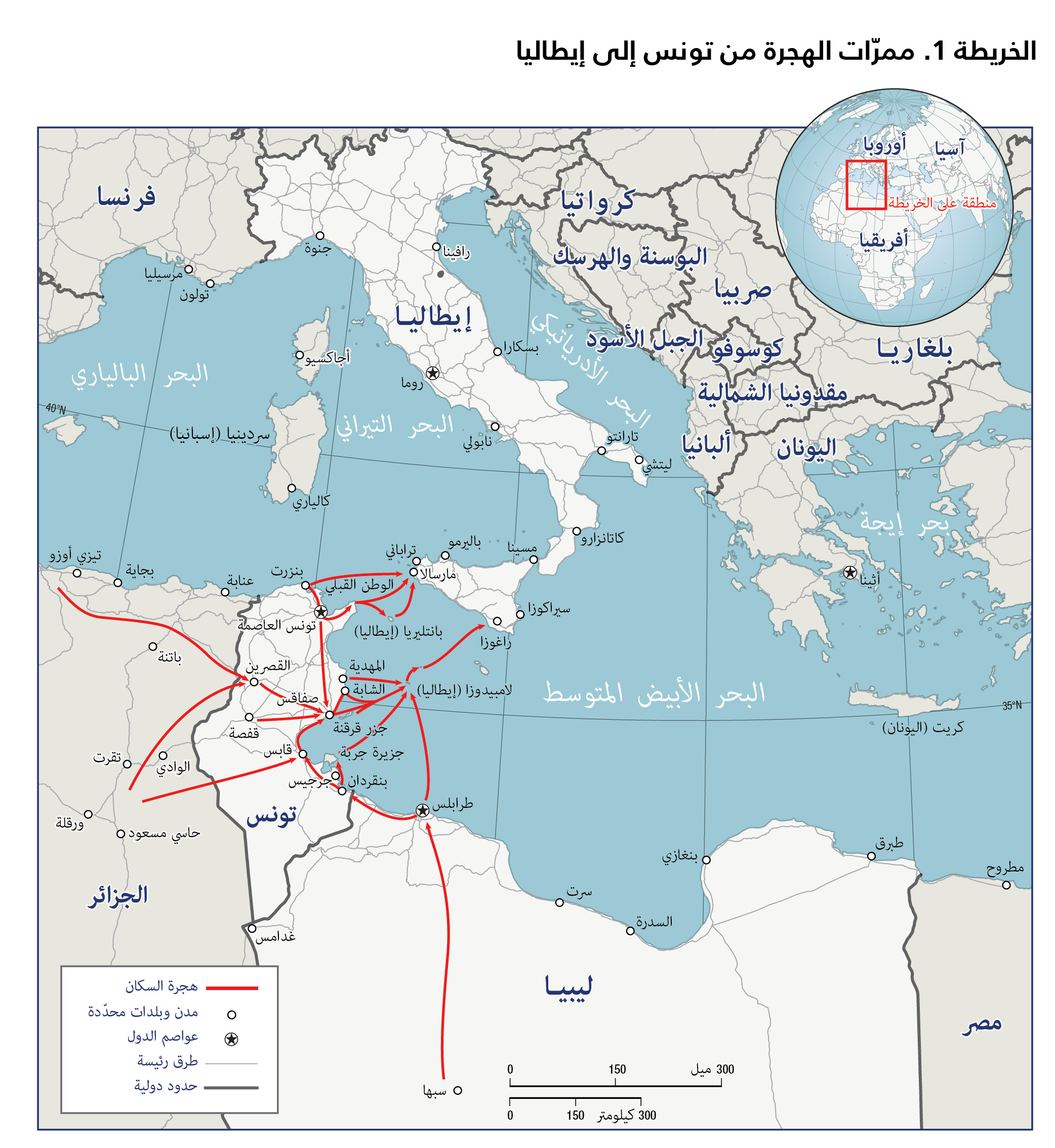 تقع تونس في صُلب تحوّل كبير يطرأ على مشهد الهجرة في منطقة البحر الأبيض المتوسط. فقد أصبحت نقطةَ عبور رئيسة للمهاجرين وطالبي اللجوء من أفريقيا جنوب الصحراء الكبرى، ولا سيما من السودان وتشاد وغينيا ومالي وساحل العاج وغيرها، بهدف الوصول إلى أوروبا.1 كذلك، أرغمت سنواتٌ من الأوضاع السياسية والاقتصادية المُتدهورة في البلاد التونسيين على الهجرة.2 لكن، خلال النصف الثاني من العام 2022، شكّل الأفارقة من جنوب الصحراء، وليس التونسيين، المجموعة الأكبر المهاجِرة إلى أوروبا من تونس.3 واكتسب هذا المنحى زخمًا في العام 2023، ما عزّز دور تونس كمركز للهجرة.