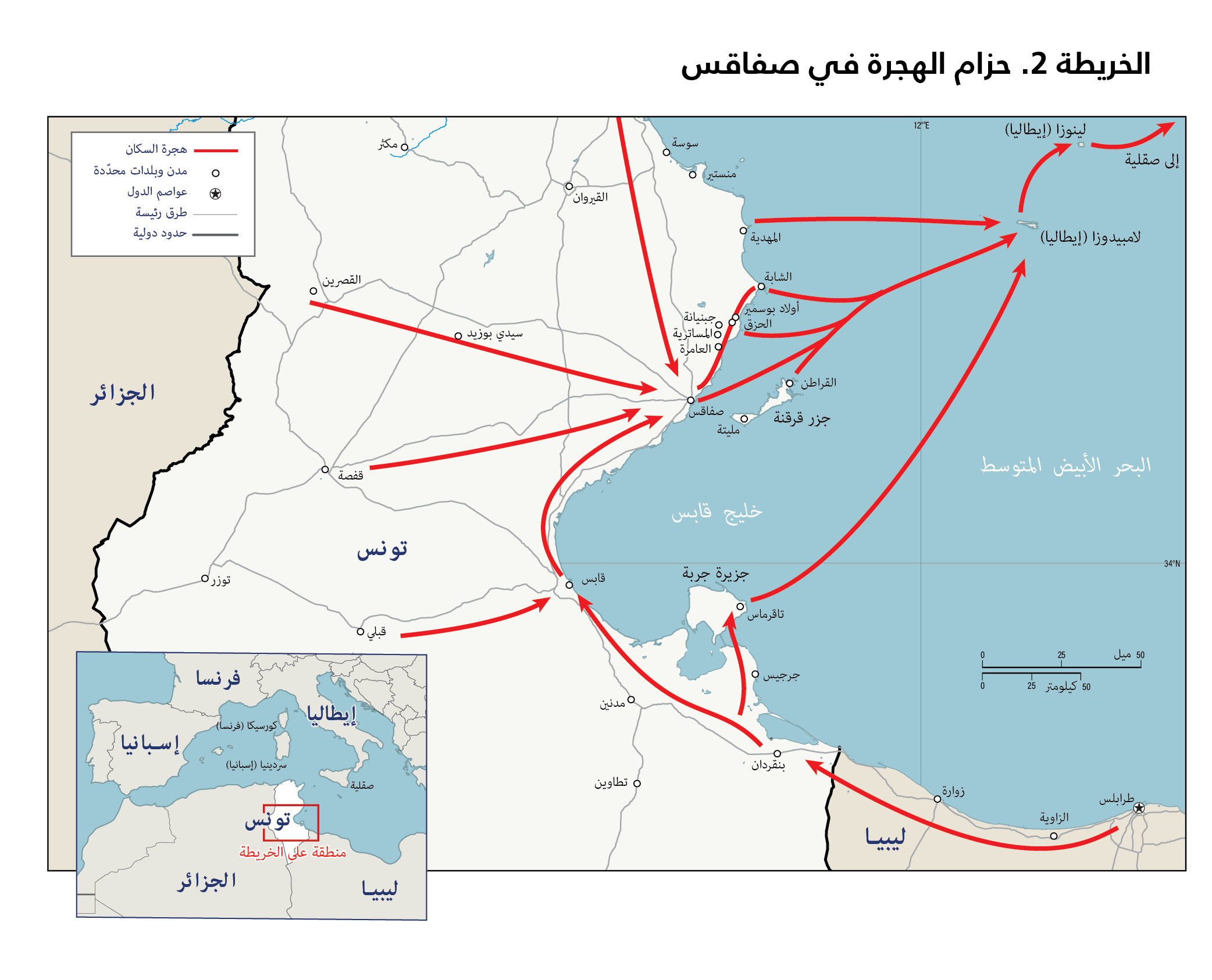 يُعَدّ الشريط الساحلي الممتدّ على طول 40 كيلومترًا بين صفاقس والشابة، وهي مدينة تقع شرق تونس على بُعد 130 كيلومترًا فقط من جزيرة لامبيدوزا الإيطالية، مسؤولًا عن 75 في المئة من القوارب المُغادِرة إلى أوروبا.46 ومن البلدات والقرى الصغيرة على طول هذا الشريط، التي تؤدّي أدوارًا مختلفةً في تسهيل الهجرة غير النظامية، نذكر جبنيانة، والعامرة، وحزق، واللوزة، وعقارب، والحميزية، والبدارنة، وسيدي مخلوف، والعوابد، وأولاد بوسمير، وملولش.47 الواقع أن نشوء بيئة الهجرة في صفاقس والمناطق المجاورة نتج عن الأزمات الاقتصادية التي تعاني منها المنطقة. فقد عَمَد الكثير من أصحاب المصالح في قطاعَي الزراعة وصيد الأسماك، وهما تقليديًا من الدعائم الأساسية لاقتصاد صفاقس، إلى تهريب الأشخاص بعدما دُفعوا نحو أشداق الفقر جرّاء سنوات الجفاف، وارتفاع تكلفة المواد الغذائية الأساسية، وسياسة التسعير الزراعي غير المتّسقة، وهي ظواهر تزامنت مع ارتفاع أعداد المهاجرين من جنوب الصحراء الداخلين إلى البلاد.48 وهكذا، ما كان في البداية نشاطًا محدود النطاق، انخرط فيه أساسًا شبابُ المنطقة في موسم الصيف، تطوّر سريعًا ليصبح تجارةً مزدهرةً على مدار السنة.