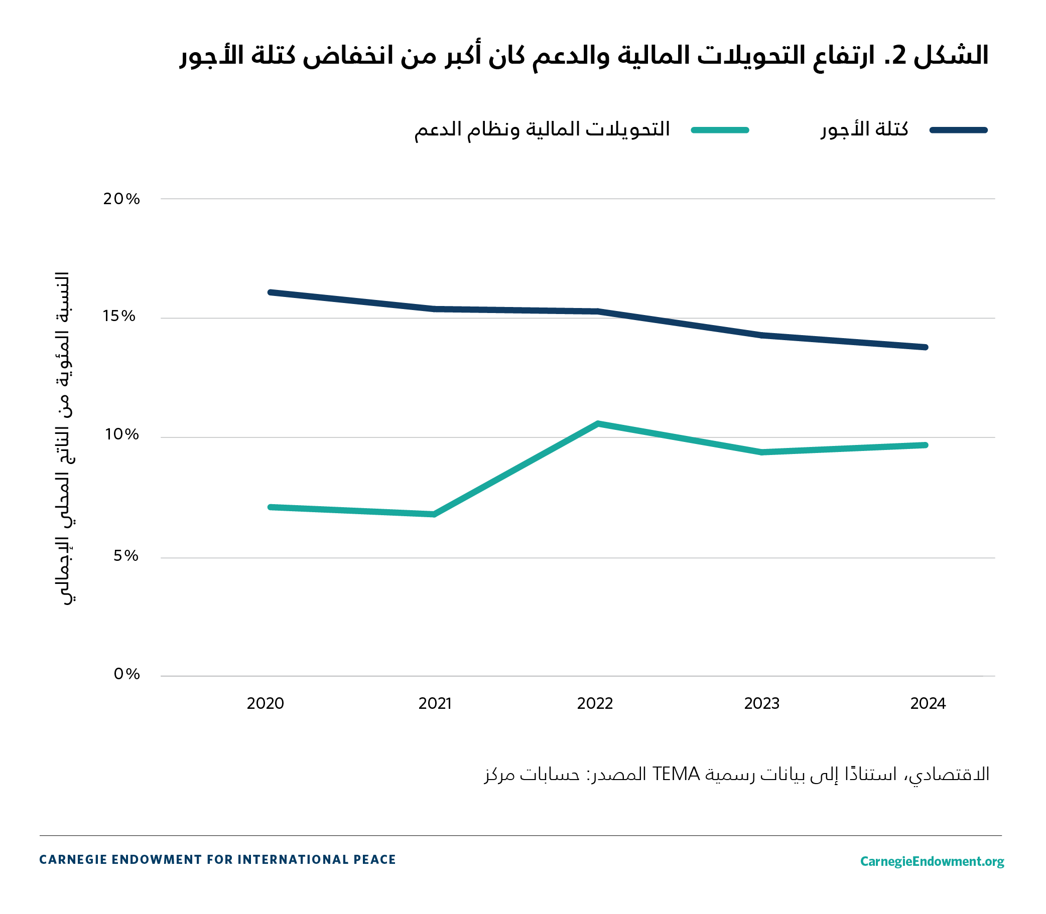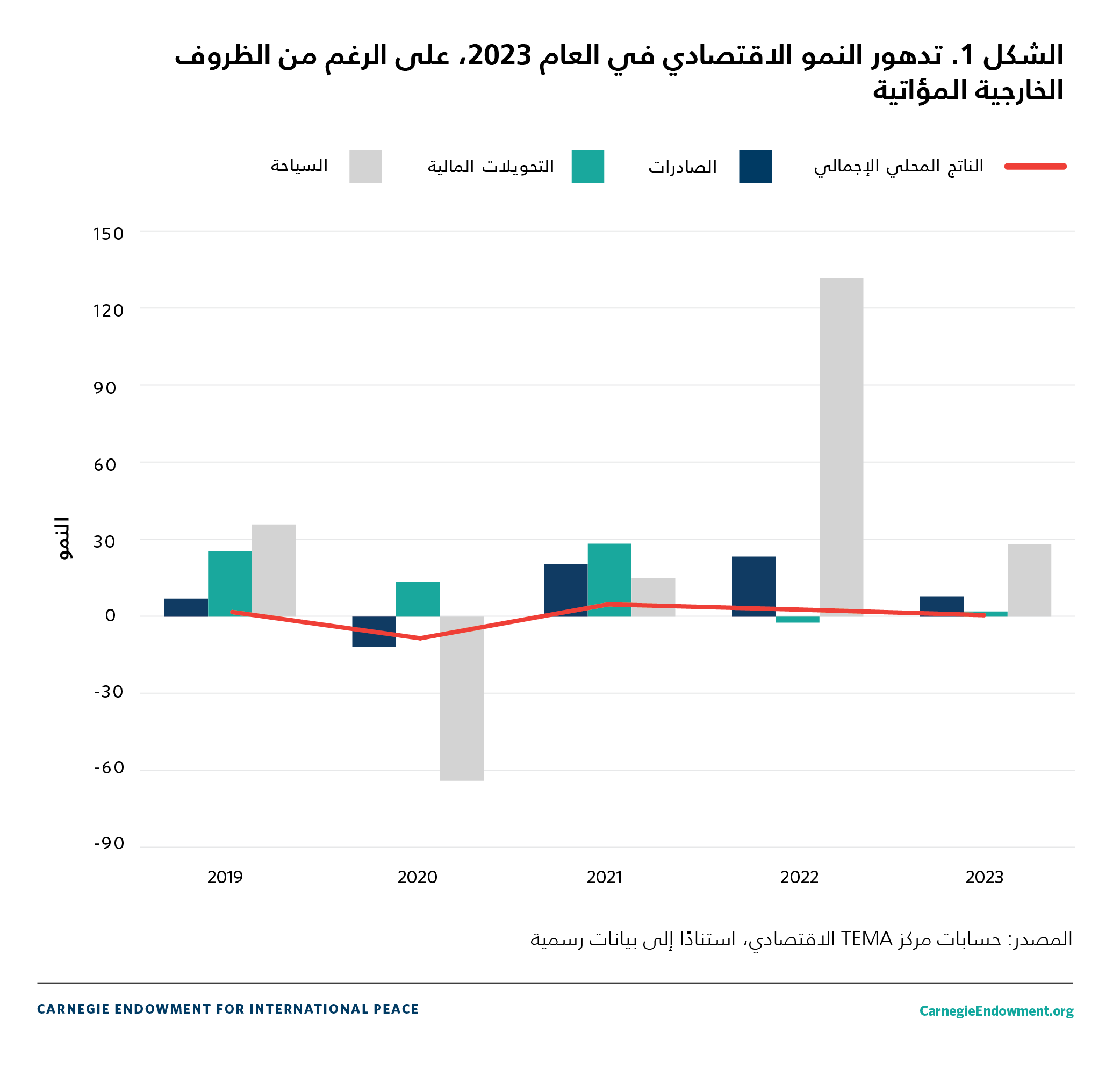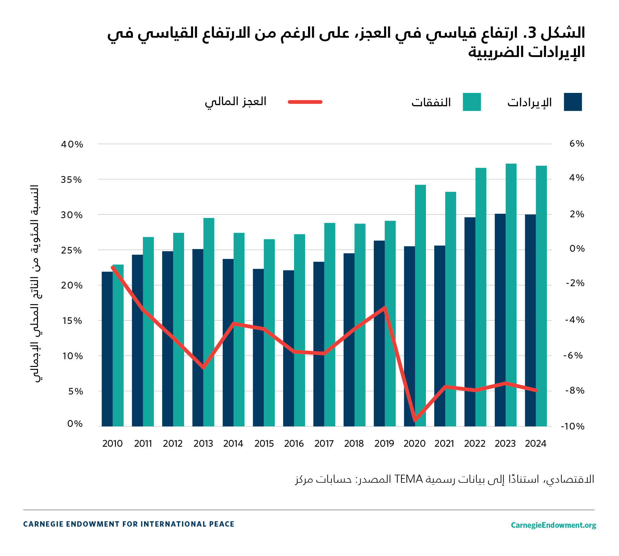 | المصدر: المعهد الوطني للإحصاء، وزارة المالية؛ مركز TEMA. بيانات فترة 2023-2024 من قانون المالية التكميلي لسنة 2023 وقانون المالية لسنة 2024؛ وتوقّعات العام 2024 من مركز TEMA وصندوق النقد الدولي. | ||||