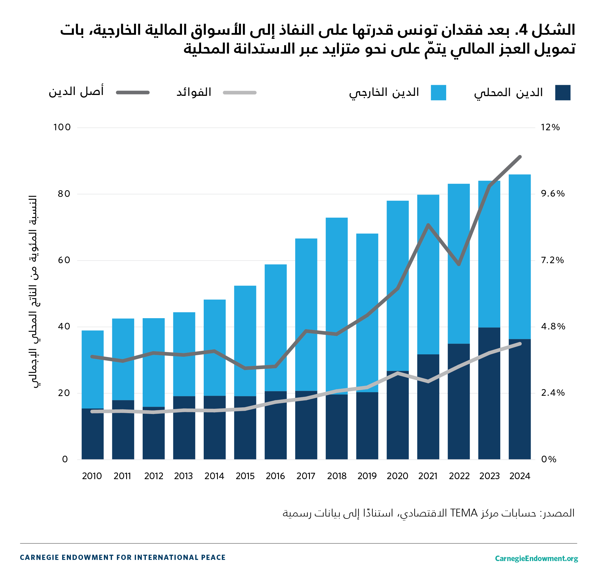في العام 2023، بلغ الدين العام الخارجي أكثر من نصف (56.7 في المئة) مجموع الدين العام. وقد شكّل ذلك 53.6 في المئة من الناتج المحلي الإجمالي في ذلك العام، وهي نسبة أقلّ من الذروة التي بلغت 65.5 في المئة في العام 2018 (انظر الشكل 4). في ضوء مستوى الدخل في تونس، لا يُعدّ هذا المستوى من المديونية الخارجية مرتفعًا جدًّا، ولا سيما أن نسبةً كبيرة منه هي من مصادر متعدّدة الأطراف بأسعار فائدة مُيسَّرة. ما يزيد من خطورة الدين الخارجي هو عدم اتّخاذ إجراءات لتسوية الوضع التمويلي. فالدين الخارجي يصبح أشدّ خطورة بسبب مخاطر ارتفاع سعر الصرف، لأن انخفاض قيمة العملة الحقيقي (لا الاسمي) يزيد التكلفة الداخلية لخدمة الدين الخارجي. وقد جرى خفض التصنيف الائتماني للبلاد مرارًا في السنوات الأخيرة، ما عبّر عن تدهور جدارتها الائتمانية. ففي حزيران/يونيو 2023، منحتها وكالة موديز تصنيف Caa2، ووكالة فيتش تصنيف CCC-، ما يشير إلى خطر كبير بالتخلّف عن السداد. وفي أيلول/سبتمبر 2024، رفعت وكالة فيتش تصنيف تونس إلى CCC+، مشيرةً إلى تعهّد البلاد بالوفاء بالتزاماتها المتعلقة بالديون الخارجية. ولكن وكالة التصنيف شدّدت على التحديات المستمرّة، بما في ذلك الحاجات التمويلية المرتفعة، ومحدودية الوصول إلى التمويل الخارجي، وعدم اليقين بشأن قدرة القطاع المصرفي واستعداده لتحمّل تمويل نسبٍ كبيرة من الدين الداخلي.