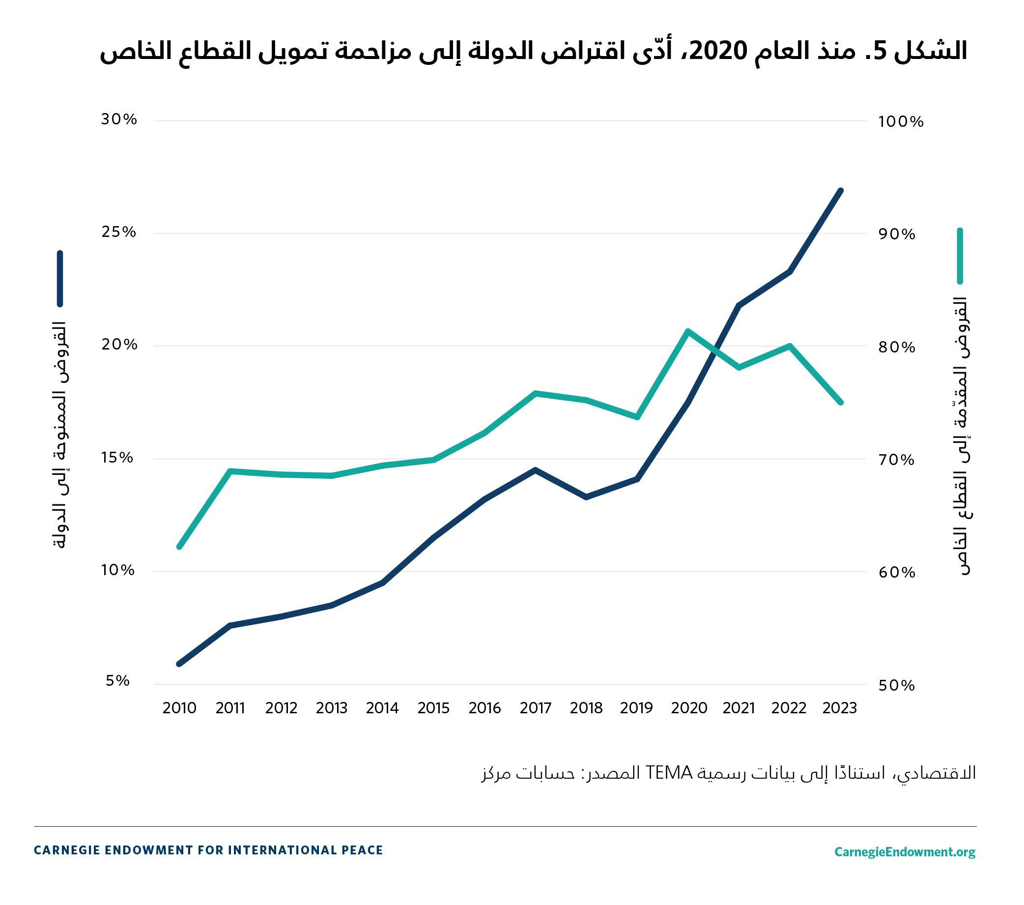 بلغ صافي مديونية الدولة للقطاع المصرفي، والتي تَضاعفت تقريبًا خلال السنوات الخمس المنصرمة، 23.6 في المئة من الناتج المحلي الإجمالي بحلول نهاية العام 2023 (انظر الشكل 5). ونظرًا إلى العوائد المغرية، والمخاطر الائتمانية التي تُعتبر منخفضة (مقارنةً بالإقراض للقطاع الخاص)، والدعم المنهجي الذي يقدّمه البنك المركزي من خلال توفير السيولة في أوقات العُسر، رحّب القطاع المصرفي بزيادة انكشافه على الديون السيادية. وتشجّعت المصارف أيضًا على التحوّل نحو إقراض الدولة بسبب تراجع الطلب على الائتمان من القطاع الخاص، نتيجة إحجام الأعمال والمؤسسات إلى حدٍّ كبير عن الاستثمار في ظلّ الأوضاع المتدهورة.