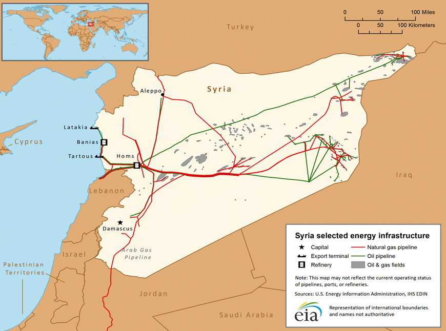الواقع أن الاعتماد على الغاز ازداد مع أن الإنتاج الوطني انخفض من 8.7 مليارات متر مكعب في العام 2011، إلى 7.6 مليارات في العام 2012، و5.9 مليارات في العام 2013، وحوالى 5.4 مليارات في العام 2014. وفي الأشهر الأربعة الأولى من العام 2015، بلغ الإنتاج 15.6 مليون متر مكعب في اليوم (5.7 مليارات متر مكعب سنوياً)، وفقاً لوزارة النفط والموارد المعدنية، مع أن مصادر مطّلعة على قطاع الغاز السوري اعتبرت ذلك تفاؤلاً مفرطاً؛ إذ أشار وزير النفط سليمان العباس في تصريح له إلى قدرٍ أكثر تواضعاً من الإنتاج يبلغ 10 ملايين متر مكعبة في اليوم (3.65 مليارات متر مكعب سنوياً) قبيل سقوط تدمر. وقد فجّر تنظيم الدولة الإسلامية في 31 أيار/مايو خط أنابيب غاز قرب منطقة الفرقلس التي يسيطر عليها النظام، كما لو أنه يشدّد على أن عنوان لعبته الآن هو حرمان النظام من الموارد الأساسية. والفرقلس تضمّ حقل غاز "هائلاً"، علماً أن حقوق التنقيب في الحقل مُنِحَت لشركة صينية، لكن عملية الاستخراج الفعلي لم تبدأ بعد. والأهم أن موقع الفرقلس يضمّ معمل إيبلا لمعالجة الغاز (الذي كانت تشغّله سابقاً شركة بترو-كندا (سنكور))، ومنشأة Stroytransgaz المجاورة لمعالجة الغاز وتوزيعه، ومحطة وصل تربط أنابيب النفط والغاز التي تضمّ الخط المعروف باسم خط الغاز العربي – الأكبر في سورية – بمحطات الطاقة وموانئ التصدير إلى الغرب.