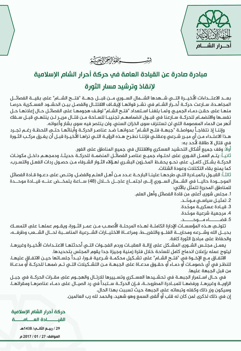 لكن الاشتباكات لمّا تتوقف، وحذّرت حركة أحرار الشام من نشوب صراع لا طاقة لأحد به. وفي 28 كانون الثاني/يناير، اندمجت جبهة فتح الشام مع أربع فصائل أخرى ضمن كيان جديد تحت مسمّى هيئة تحرير الشام. الفصائل التي يضمّها هذا الكيان الجديد هي: