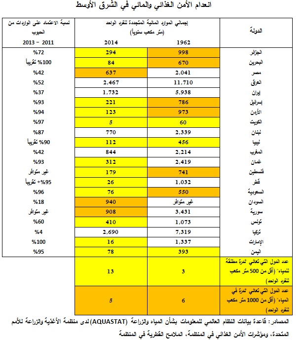 تستورد الدول العربية أساساً نصف قمحها تقريباً، الذي يقدّر أنه يشكّل 37 في المئة من استهلاك السعرات الحرارية في المنطقة. ويعاني ما لايقل عن نصف دول المنطقة من نسب تتجاوز 80 في المئة في ما يتعلق بالاعتماد على واردات الحبوب (انظر الجدول). وتشير الإسقاطات الإحصائية الصادرة عن المعهد الدولي لبحوث السياسات الغذائية إلى أن واردات الحبوب إلى الشرق الأوسط سترتفع من 59 مليون طن متري في العام 2010 إلى 94 مليون طن متري في 2030 و141 مليون طن متري في 2050.
