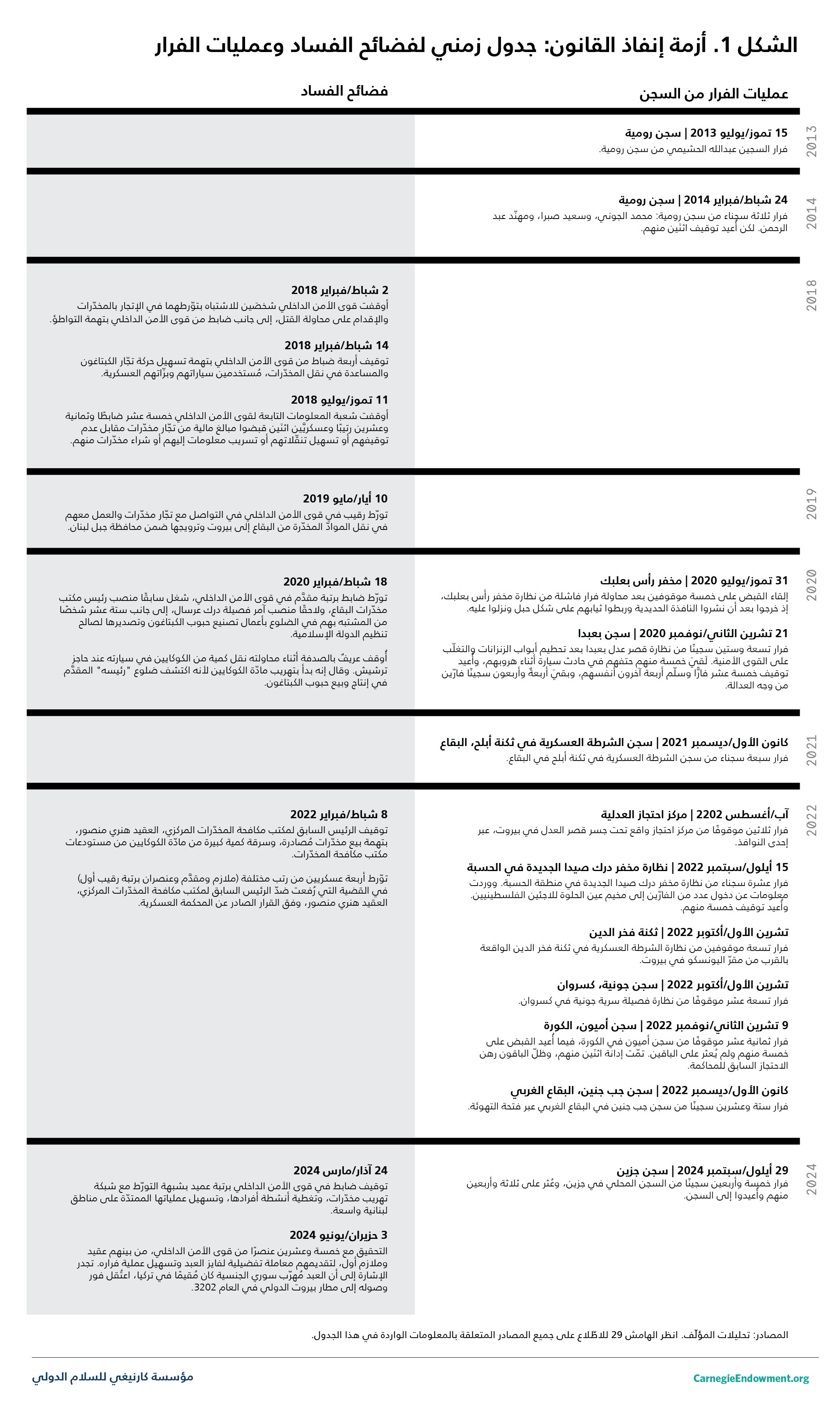 برزت مرارًا وتكرارًا أمثلةٌ إضافية عن المعاملة المتساهلة التي تلقّاها الموقوفون في قضايا المخدّرات، ولا سيما بُعيد الأزمة المالية والاقتصادية في فترة 2019-2020، نظرًا إلى انهيار قيمة الليرة اللبنانية، وبالتالي تدنّي القدرة الشرائية للضباط والجنود. وفي العام 2018، اتُّهم أربعة ضباط من قوى الأمن الداخلي بمساعدة شبكات الكبتاغون في نقل المخدّرات، مستخدمين سياراتهم وبزّاتهم العسكرية.89 يُشار إلى أن التحقيقات التي أُجريت بعد العام 2019 حول تورّط عناصر في قوى الأمن الداخلي بتجارة المخدّرات كانت أوسع نطاقًا بكثير. إحدى القضايا البارزة كانت توقيف الرئيس السابق لمكتب مكافحة المخدّرات المركزي في لبنان، وهو عقيد في قوى الأمن الداخلي، في مطلع العام 2022 بتهمة بيع كمية من المخدّرات المضبوطة.90 أما القضية الأحدث فكانت التحقيق مع خمسة وعشرين عنصرًا من ضباط ومفتّشي الأمن العام على خلفية المعاملة التفضيلية التي حظيَ بها تاجر المخدّرات السوري الجنسية فايز العبد خلال فترة اعتقاله، ثم تسهيل هروبه من السجن، بعدما جرى توقيفه في العام 2023 عند وصوله إلى مطار بيروت الدولي، آتيًا من تركيا.91 تُظهر هذه القضايا كيف استخدم تجّار المخدّرات صلاتهم السياسية ونفوذهم المالي لدفع الرشاوى إلى عناصر قوى الأمن وتقويض سلطة الأجهزة الأمنية (انظر الشكل 1).92