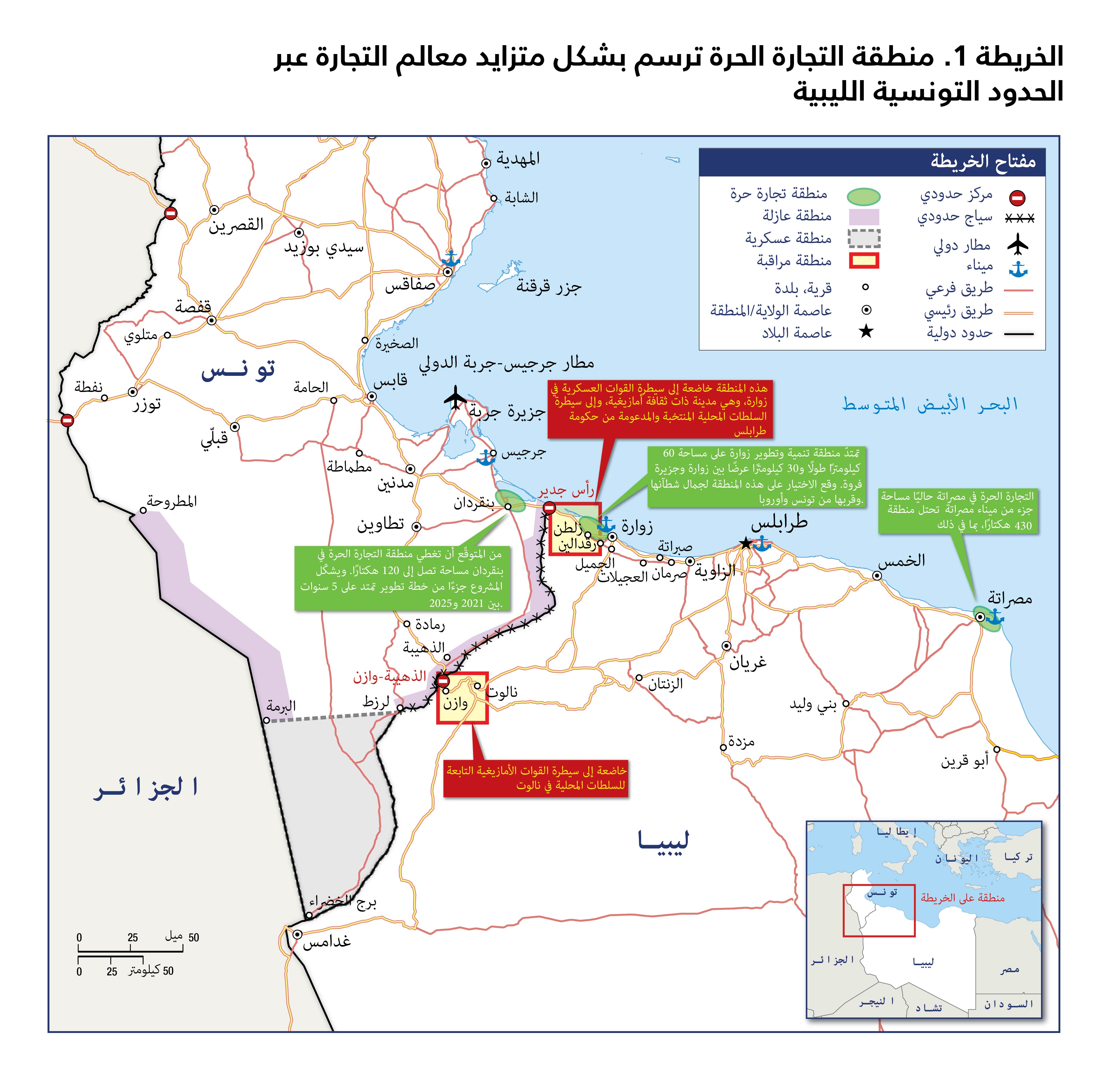 أعلنت تونس، في العام 2012، عن إنشاء منطقة للتجارة الحرة والخدمات اللوجستية في بنقردان بالقرب من الحدود الليبية، بهدف تطوير المناطق الحدودية المهمّشة في جنوب شرق البلاد وإضفاء الطابع الرسمي على الأفرقاء الاقتصاديين غير الرسميين. مع ذلك، تعثّرت الخطة بسبب المقاومة المؤسّسية، والانقسامات السياسية، والعجز عن استغلال التنافس الجيوسياسي الدولي لصالح تونس. وإذا استمر الوضع على هذا المنوال، قد يفقد المشروع أهميته بسبب مناطق التجارة الحرة الناشئة في ليبيا، ما يحرم تونس من العائدات التي يحتاجها اقتصادها المتداعي.