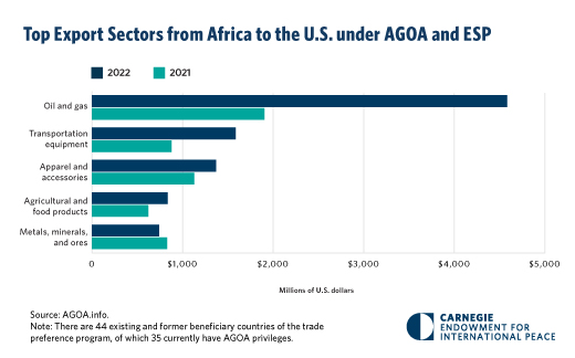 The first week of November, Carnegie Africa attended the African Growth and Opportunity Act (AGOA) Forum, hosted this year in Johannesburg, South Africa. We were able to sit in on discussions with the private sector, government representatives, and civil society regarding the future of the trade program as it is set to expire in 2025. There was general consensus on AGOA’s reauthorization—backed by statements of support from President Biden and a bipartisan group of over 13 U.S. senators. Most stakeholders also agreed on aligning AGOA with the African Continental Free Trade Agreement (AfCFTA), as well as focusing on new and underutilized sectors, such as pharmaceuticals, digital services trade, and transition minerals. Our Chart of the Month, included below, makes clear that minerals trade is an underutilized aspect of AGOA. It is derived from our recent report that considers how AGOA can be leveraged to meet both U.S. strategic minerals needs and African priorities for processing and adding values to these resources on the continent.