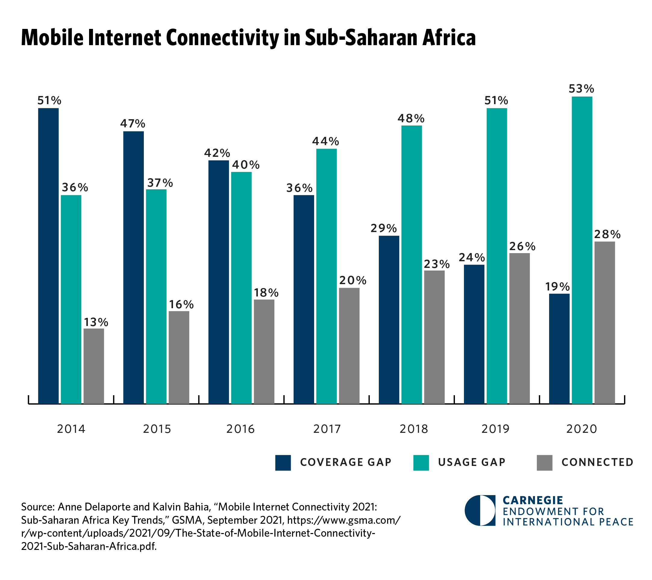 Yet, to reap the benefits of increased digital connectivity in Africa, there must be policy shifts that address a “usage gap” that, Jane Munga explains, is caused by limited penetration of smart phones and high costs of internet data. Our chart of the month illustrates this growing usage gap among populations that are increasingly living in areas covered by mobile broadband.
