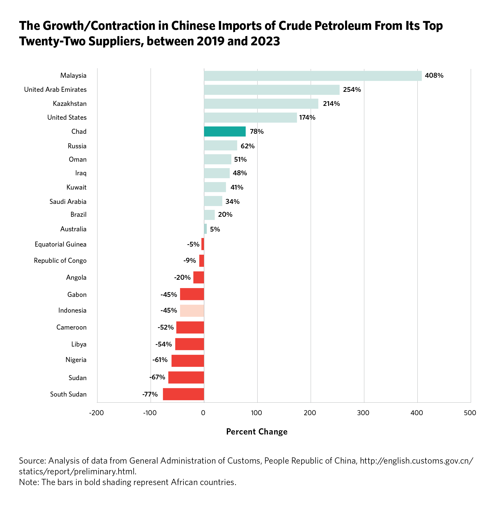 Our Chart of the Month illustrates the growth or contraction in China’s imports of crude petroleum from its top twenty-two suppliers between 2019 and 2023. Oil imports from African countries are declining as China increasingly sources its crude oil from other regions.