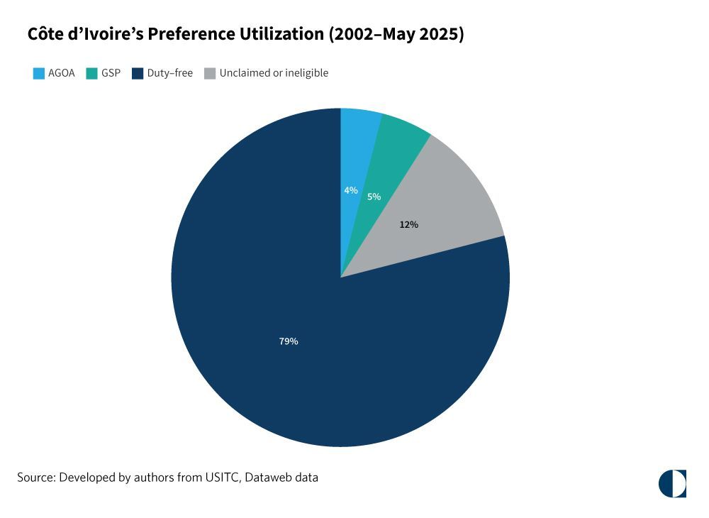 Our Chart of the Month illustrates Côte d’Ivoire’s under-utilization of AGOA and offers insights into improvements for the future. Between 2002 and May 2025, 4 percent of Ivorian exports were claimed under AGOA. Five percent were claimed under the Generalized System of Preferences (GSP), another trade U.S. program. Twelve percent of products could not be claimed under any trade program. Most Ivorian exports (79 percent) that entered the U.S. benefited from duty-free exemptions, indicating that AGOA provided minimal trade advantages to Côte d’Ivoire. This underscores a prevalent critique of AGOA, namely that it had structural deficits that prevented it from becoming the preferred U.S. trade program for most African countries.