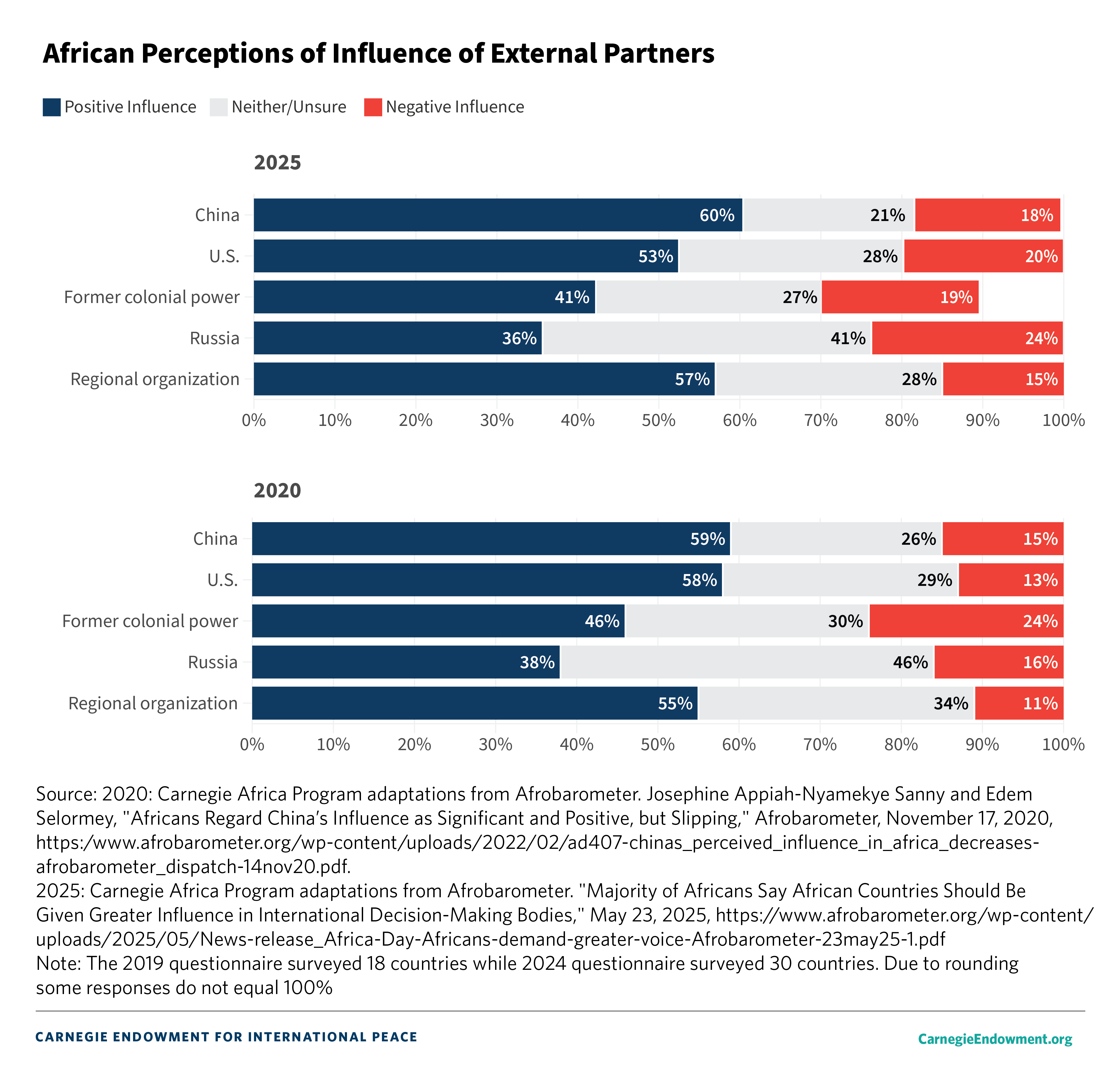 Still, China’s announcement gives it a narrative win, especially when juxtaposed with U.S. efforts to restrict African market access. It is therefore not surprising that China now ranks higher than the U.S. in African public opinion. In the Afrobarometer’s survey round 10, countries were asked: Do you think that the economic and political influence of each of the following countries or organizations on [country] is mostly positive, mostly negative, or haven’t you heard enough to say? As a result, 60 percent of Africans view China’s influence positively, compared to 53 percent for the U.S. and 49 percent for the European Union. These perceptions have shifted since 2020, with ratings rising by 1 percentage point for China (59%) and a 5-point drop for the U.S. (58%). (See our July Chart of the Month below.)