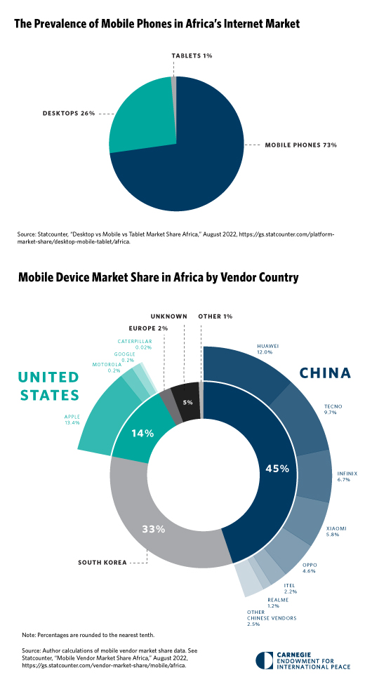 Africa’s mobile phone market is one area that will be affected by U.S.- China tech decoupling. Africa is a mobile-first continent, where about 70% of people access the internet through mobile devices. Nearly half (45%) of these mobile devices are brands incorporated in China, followed closely by South Korean brands (33%), American brands (14%), and others, as we indicate in the October 2022 Chart of the Month. As Jane Munga and Kyla Denwood explain, current and future demand for mobile devices throughout the continent will allow mobile phone vendors to influence how millions of Africans connect to the internet. This latent demand also means that Africa’s projected population of 2.5 billion people by 2050 could shape the future of these global tech companies.