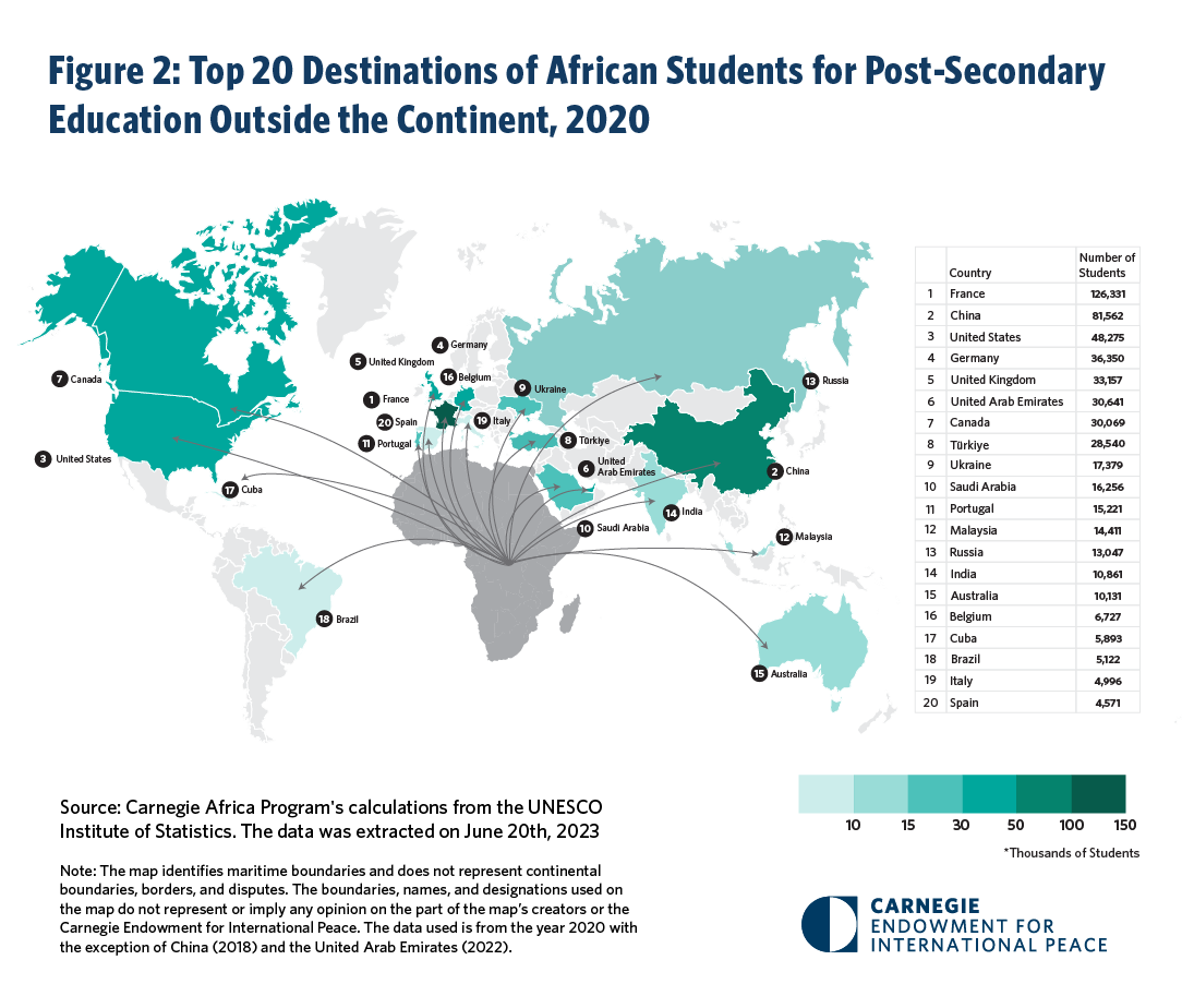 As our chart of the month indicates, France is the most popular destination for Africans seeking higher education outside the continent, hosting ~126,000 African students. China comes in second with ~ 81,500 students, while the U.S. comes in third with approximately 48,000 African students. Other countries among the top 20 destinations for African students outside the continent include Germany, United Kingdom, UAE, Canada, Türkiye and Ukraine. In addition, there has also been a growing trend of intra-Africa student mobility for higher education, countries such as South Africa, Morocco, Senegal, and Ghana have emerged as the new hot zones for many African students. Read more