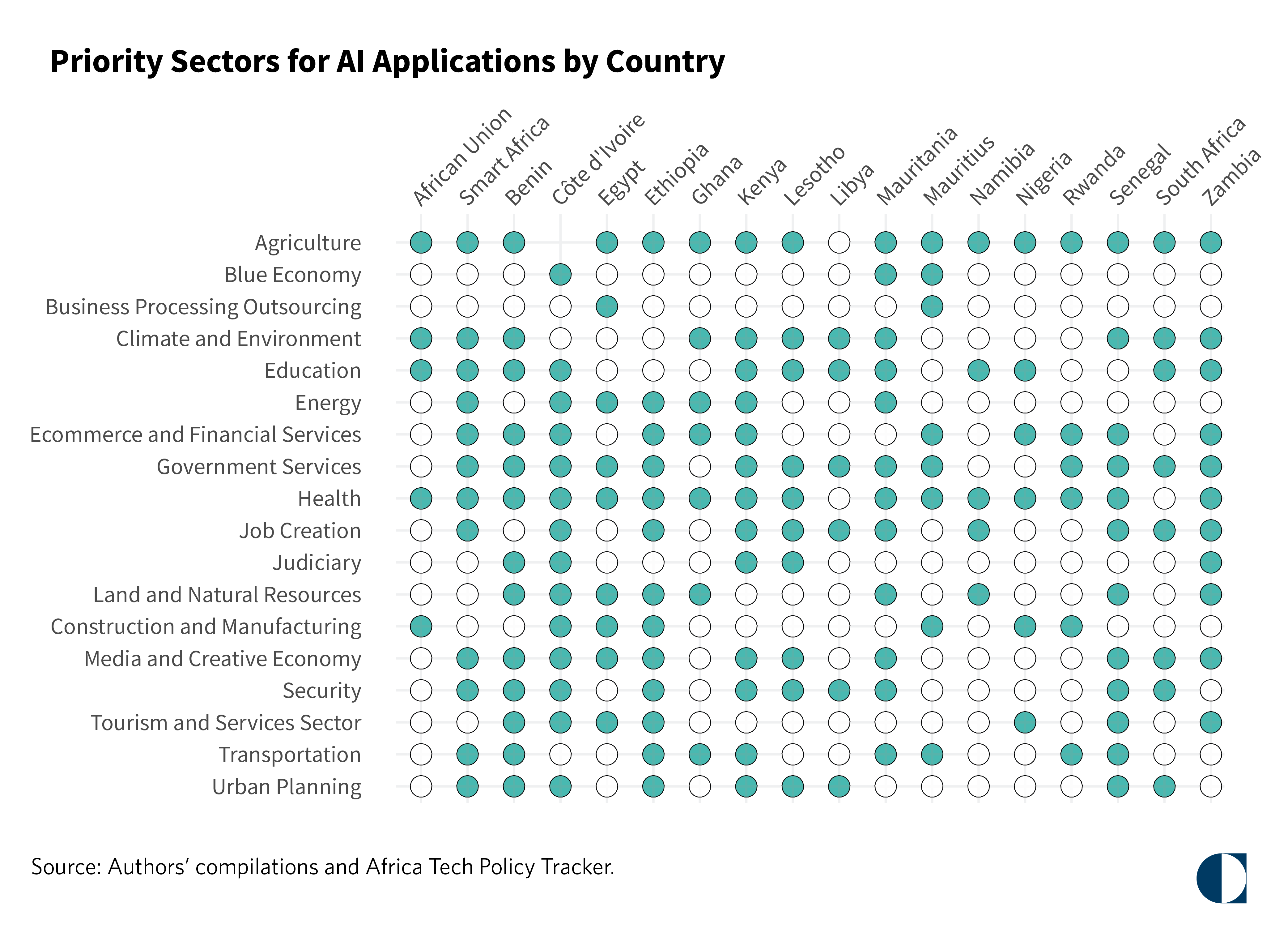 As shown in our Chart of the Month, national strategies tend to highlight key sectors to boost socioeconomic outcomes, and focus primarily on agriculture, government services, and health. While encouraging, governments and stakeholders must move from strategy to implementation, from vision to innovation, and dialogue to impact. Success will depend on developing real AI use cases that serve Africans, especially youth, and position Africa as a global AI leader.