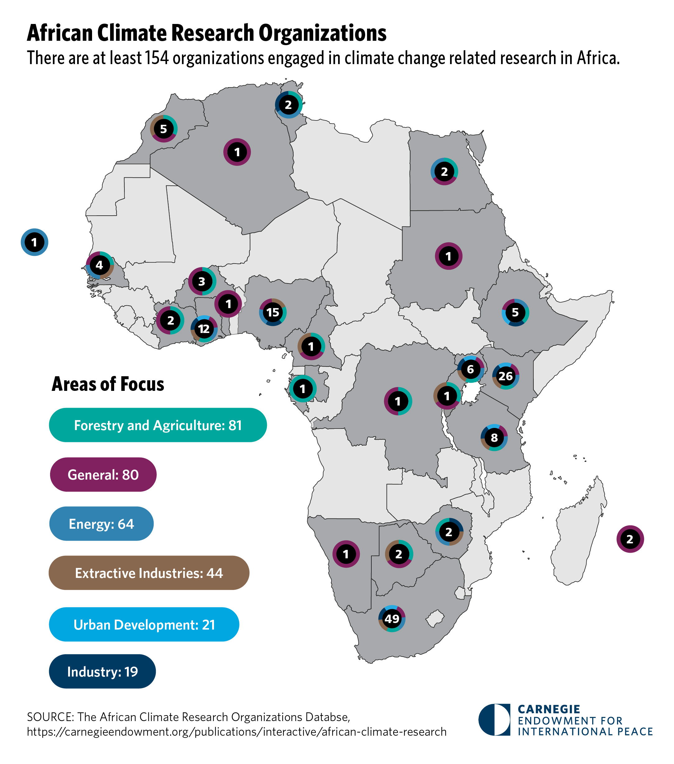 To help address the problem of underrepresentation of African voices in climate science, policy and debate, we have launched an African Climate Research Organizations Database. Expanding on an initiative we started in 2021, the database is an interactive website that compiles a list of Africa-based research organizations working on climate-related technical and policy issues. We have tracked at least 154 Africa-based organizations working on various climate change-related areas. These include entities working on agriculture and forestry (81), energy (64), extractive industries (44), urban development (21), and industry (19), across over 20 countries on the continent, as our Chart of the Month below illustrates. Do look up the database, read the background note, and let us know if you have any suggestions and feedback as this is a work in progress to help increase the visibility of African climate researchers.