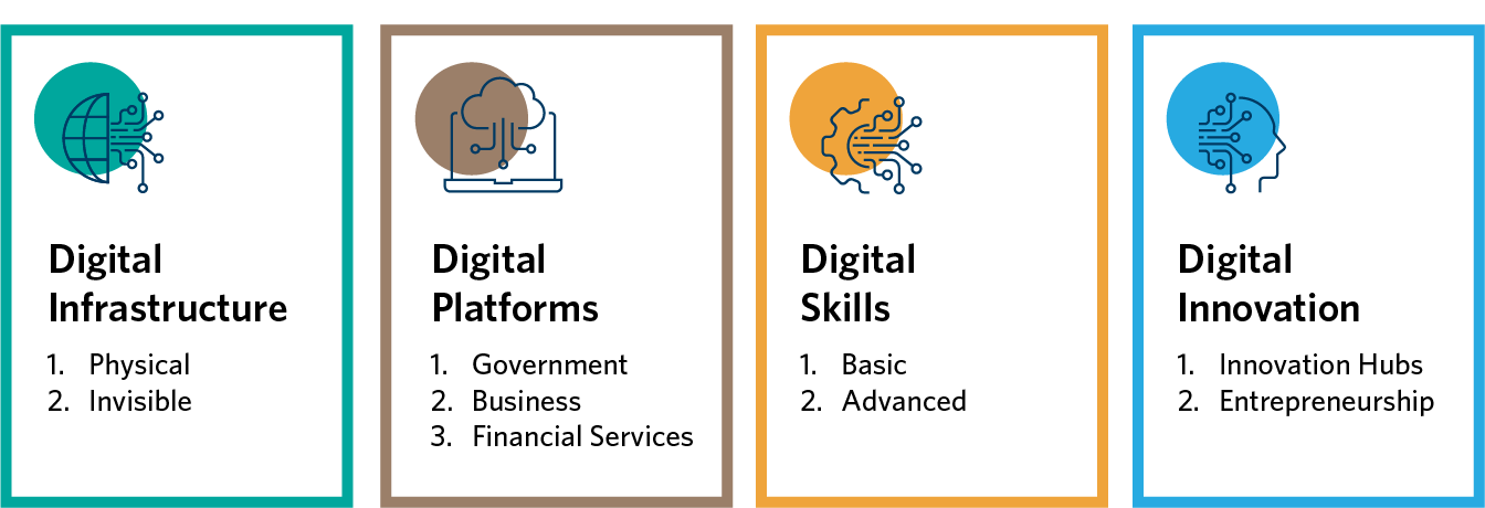 a. Digital Infrastructure: The availability of affordable and quality internet which is instrumental to bringing more people online;
