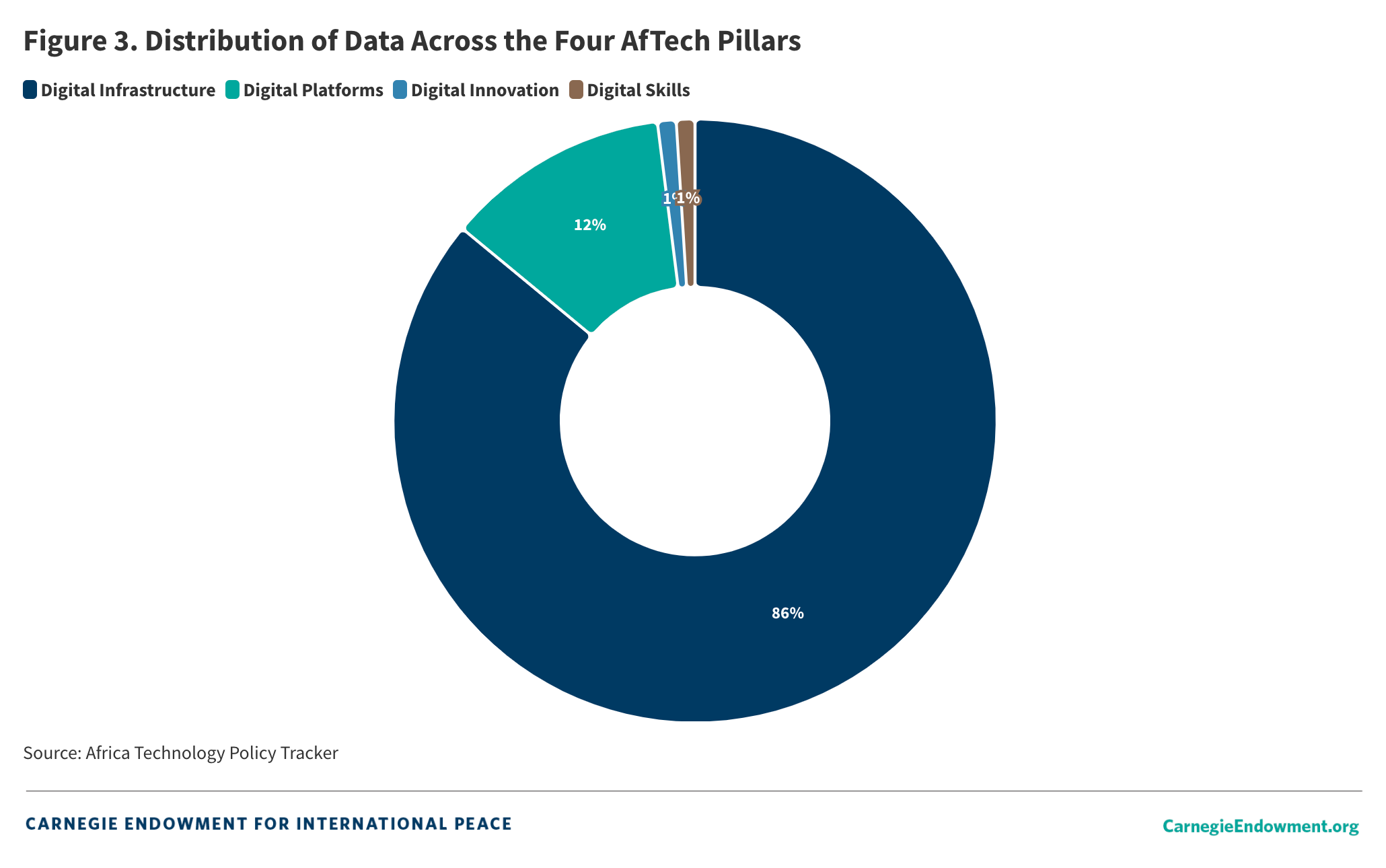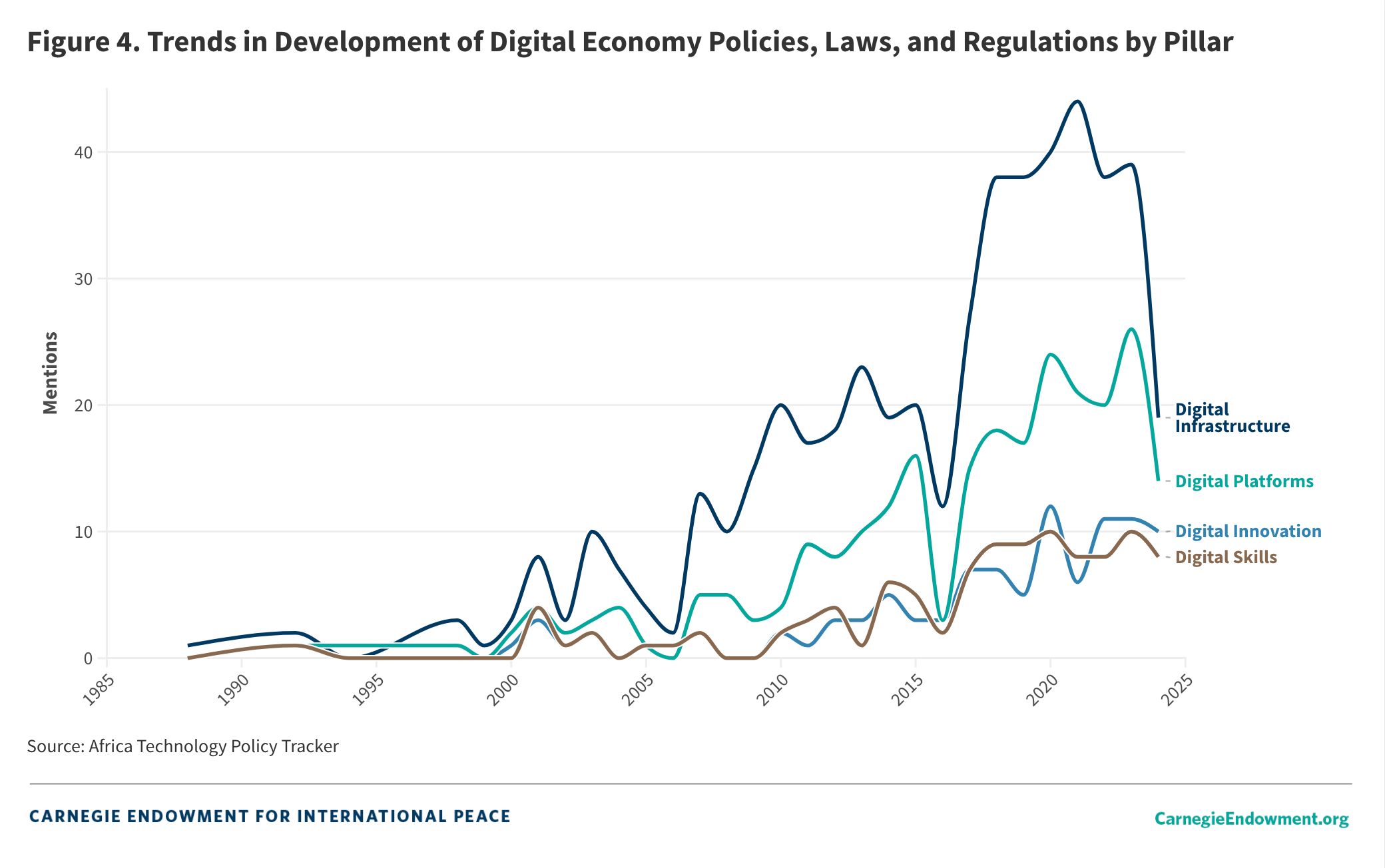 c. By Pillar: Data breakdown by pillar reveals that the digital infrastructure pillar (500) has received the most policy attention, followed by digital platforms (246), digital skills (105), and finally innovation and entrepreneurship (101) (see Figure 3). Most documents touch on more than one pillar, revealing a desire for cross-cutting frameworks within the digital economy spectrum.