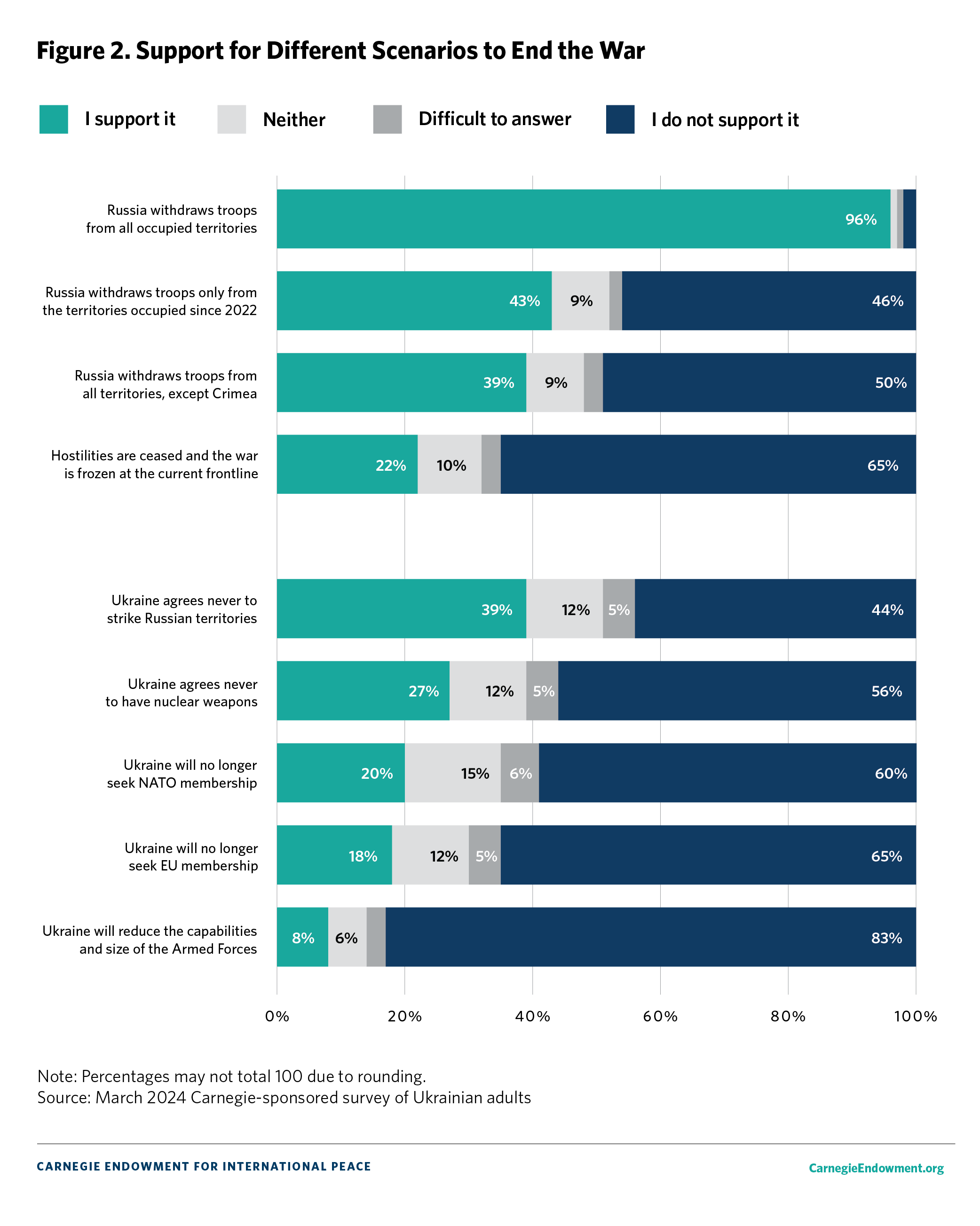 The data analyzed here are based on a survey of 2,000 Ukrainian adults from all regions of Ukraine, except for the temporarily occupied territories of Crimea and Donbas and territories lacking Ukrainian cellular coverage at the time of the survey. The survey was conducted via computer-assisted telephone interviewing and the results were weighted by age, sex, and type of settlement (urban versus rural) to ensure a representative sample. The survey was designed by scholars at the Carnegie Endowment for International Peace and was conducted by the Ukrainian sociological organization Rating Group from March 7–10, 2024. Overall results have a margin of error of plus or minus 2.2 percent; the margin of error for individual demographic sub-categories is higher.