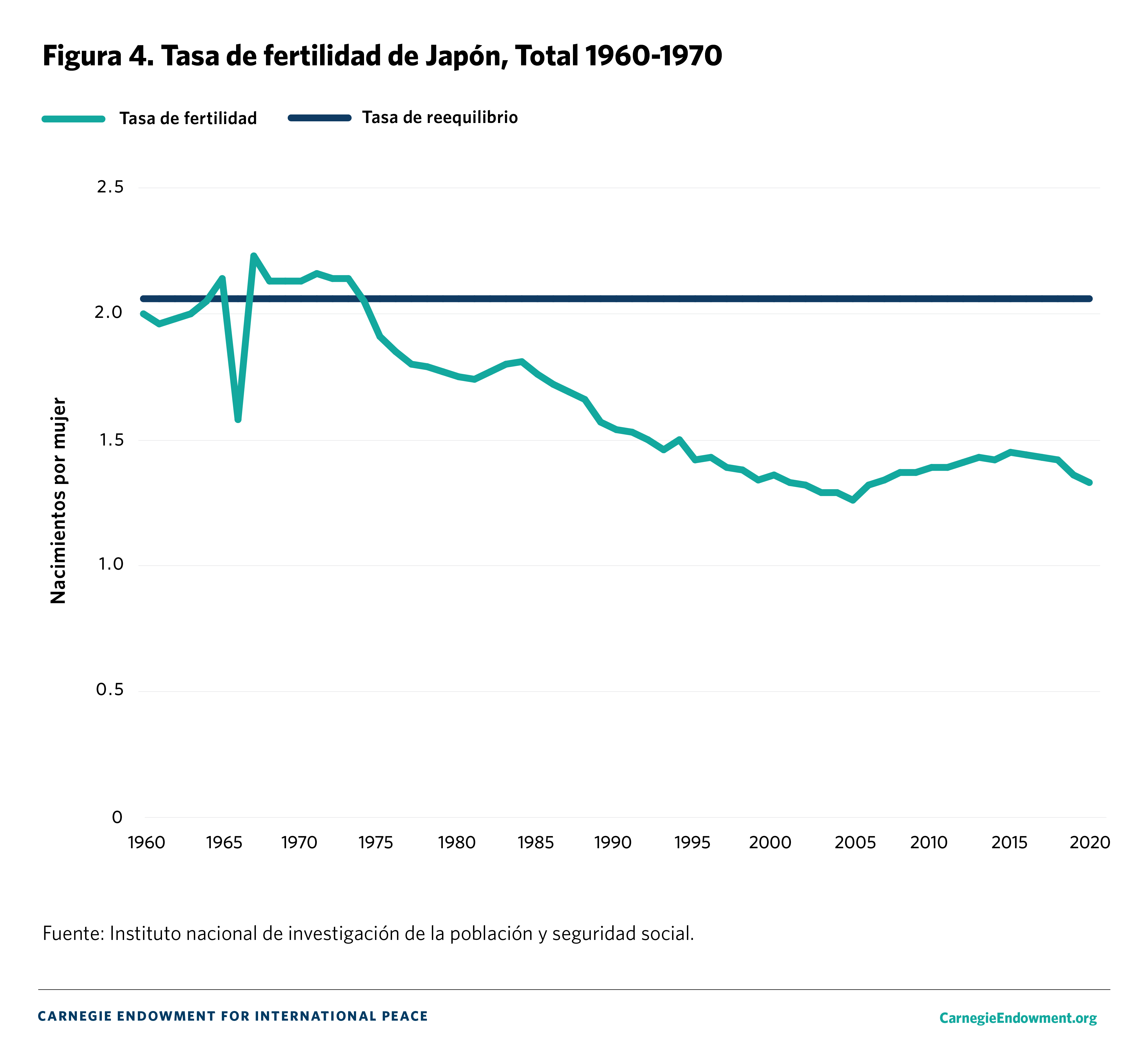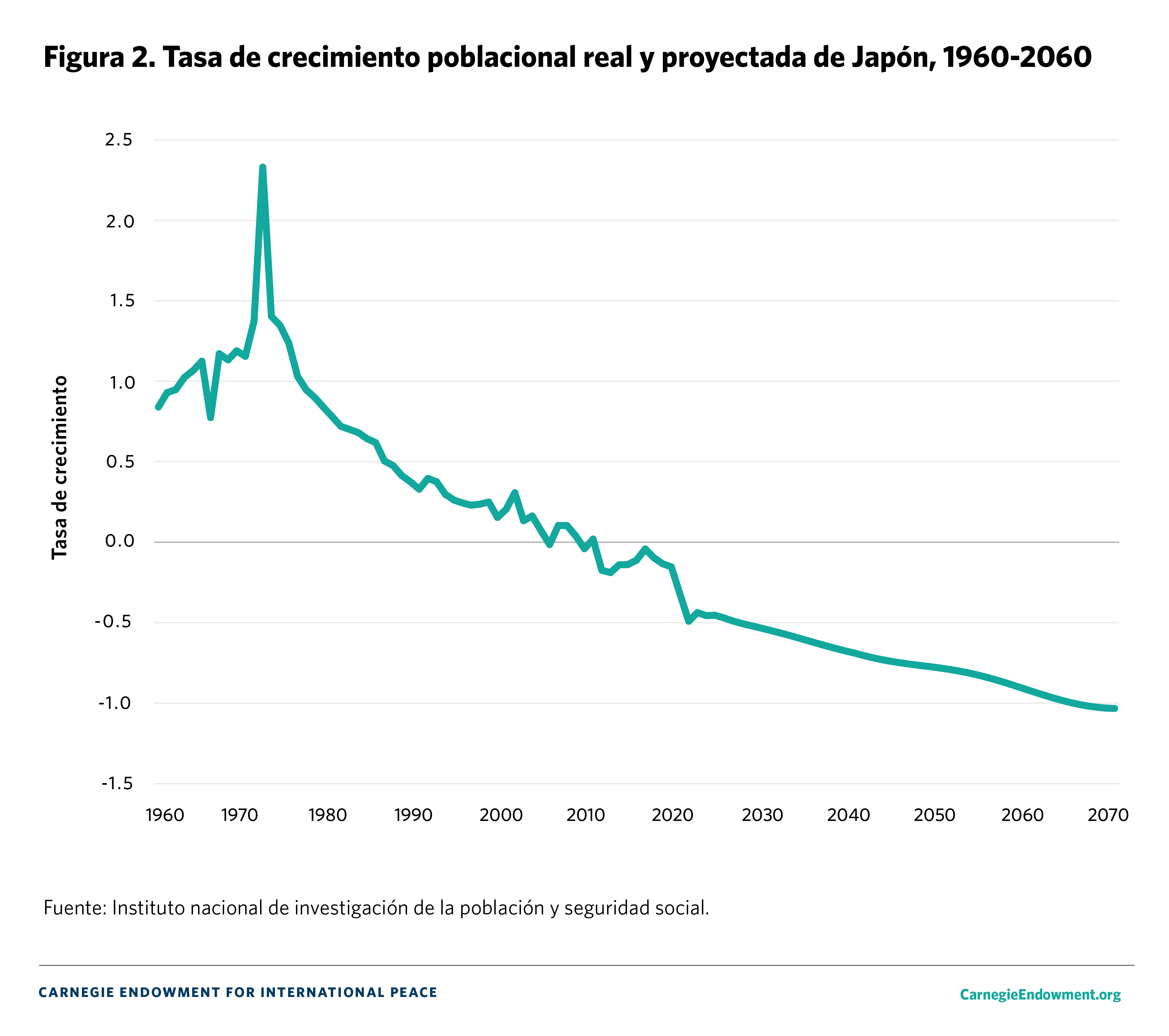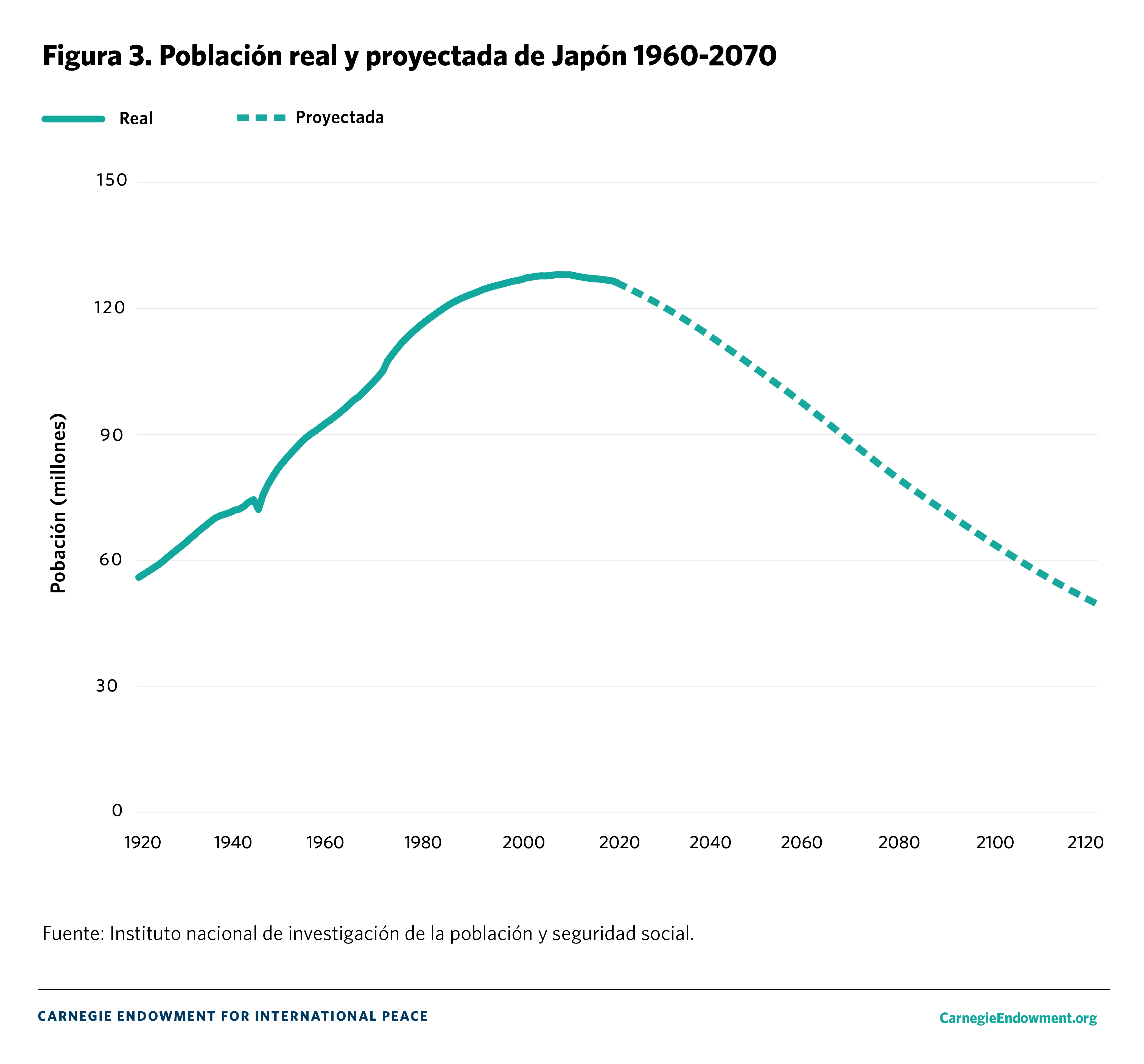 El crecimiento de la población de Japón disminuyó abruptamente luego de 1970, llegando a un pico de 128 millones en 2010. Entre 2015 y 2021 Japón perdió a más de 1.5 millones de personas, y las tasas de natalidad que decaen están acelerando la disminución de la población (véase las Figuras 2 y 3).26 Ninguna otra nación industrializada y avanzada ha experimentado, todavía, una reducción de su población de esta magnitud.