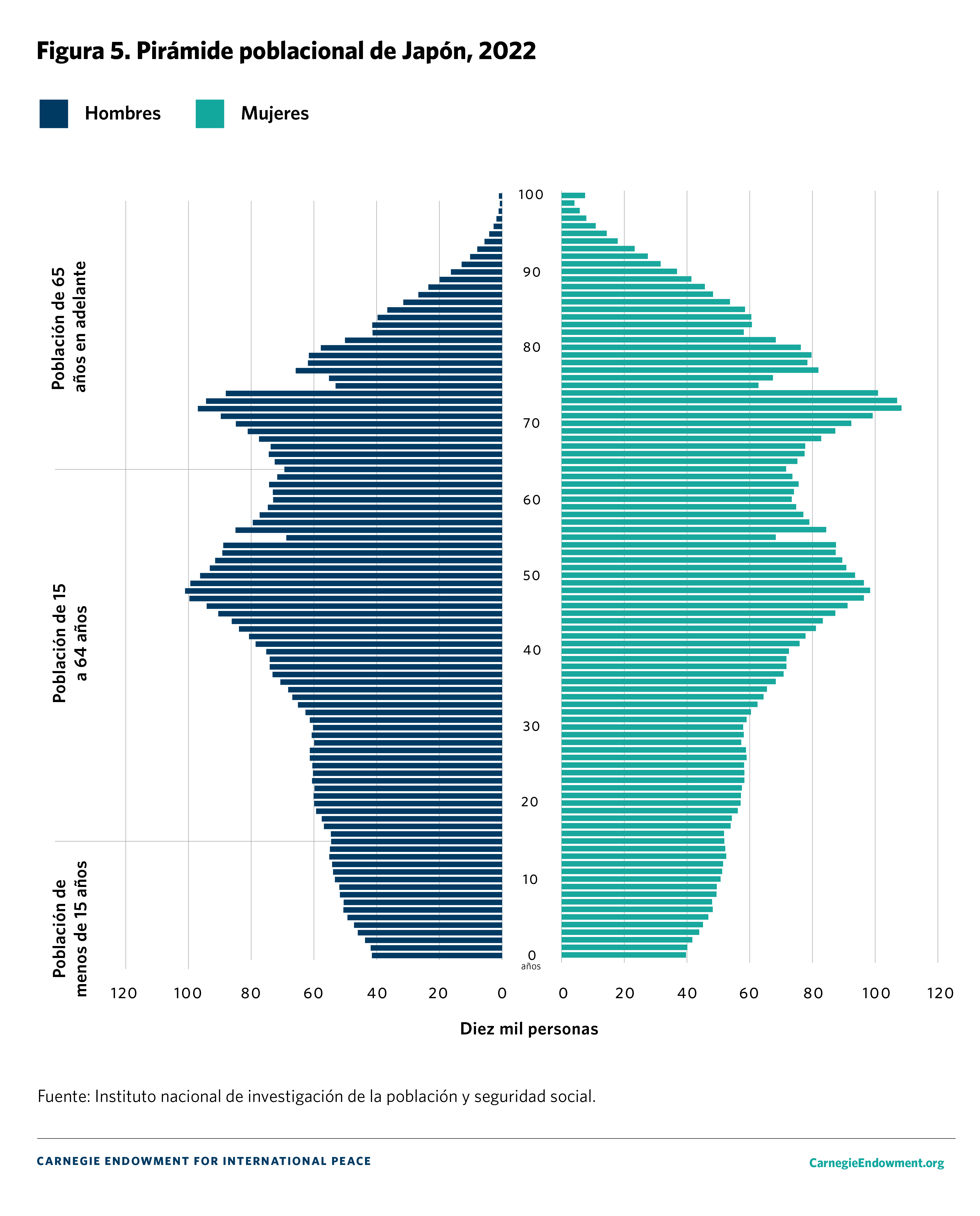 Además de la reducción, la población de Japón está envejeciendo, teniendo casi el 30 por ciento de la población más de sesenta y cinco años de edad en 2021. El gobierno proyecta que este número crezca a más del 35 por ciento para 2040.27 La pirámide de la población de Japón se invierte, con una base marcadamente más pequeña de personas más jóvenes que dan soporte a una población más grande de adultos (véase la Figura 5).