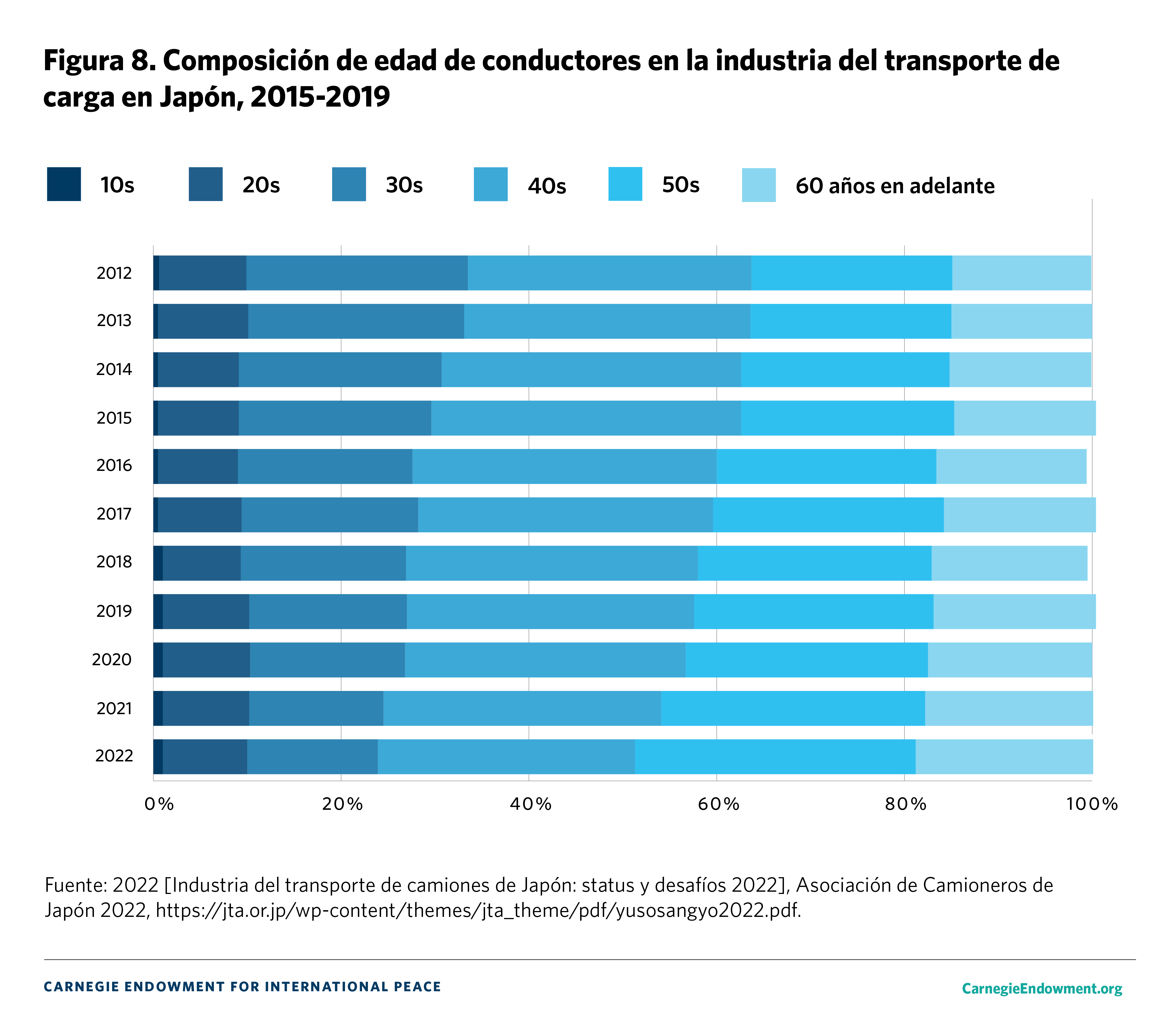 Cuando se descompone en algo específico, el grado de envejecimiento en Japón es sorprendente: la edad promedio de agricultores (cuya ocupación primaria hubiese sido la agricultura lo opuesto a agricultores a medio tiempo) fue 69.5 en 2021, la edad promedio de los conductores de taxi fue sesenta en 2019, y las edades de los conductores de camión promediaba cuarenta y ocho en 2020. Algunas medidas paulatinas y provisionales son extremas, como, por ejemplo, el incremento del límite de edad máxima para conductores de taxi hasta ochenta.6