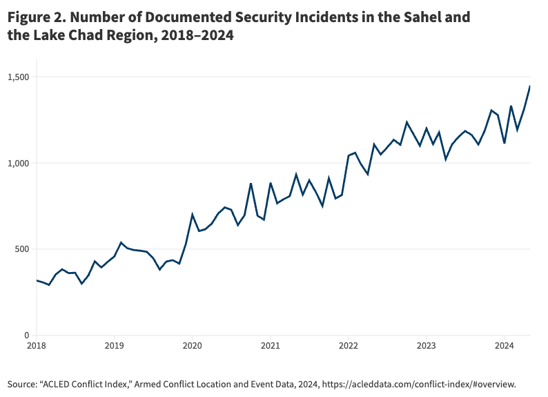 The region’s multifaceted crises have resulted in significant humanitarian impacts and deeply unsettling changes to political regimes. The UN estimates that in 2024, more than 32 million people in the Sahel require humanitarian assistance.20 More than 7 million people have been displaced either within national borders or to other countries, and there are no signs of an improvement to the crisis.21 Food insecurity is a major issue, and conflict-affected areas are systematically classified as suffering from a food security crisis.22