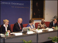 IMGXYZ728IMGZYXAlthough the US Farm Bill debate has engaged many domestic groups, the effects of US farm policies are felt far beyond US borders, and have economic and social implications for rural sectors in developing countries. While the next Farm Bill is being debated in Congress, the Carnegie Endowment for International Peace hosted a timely discussion on the forthcoming findings of a study to be published by the International Food & Agricultural Trade Policy Council (IPC) on what impacts US farm policies have on developing countries. The discussion, held on June 27, 2007, focused on the implications of US policy, the role of energy, the Doha Round, and white commodities in the Farm Bill debate, international food aid, and impacts on African agriculture. The featured speakers were Robert L. Thompson, IPC member and Gardner Endowed Chair in Agricultural Policy at the University of Illinois at Urbana-Champaign, and Mary Chambliss, independent consultant on international food aid issues. Mr. Samuel Amehou, Ambassador of Benin in Geneva and the former coordinator of the African Group, along with IPC Member Michel Petit, Professor at the Institut Agronomique Mediterraneen, served as commentators, and Sandra Polaski, director of the Trade, Equity and Development Program at the Carnegie Endowment, served as moderator.
