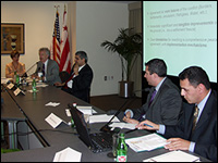 Maen Areikat, Gregory Khalil, and Khaled Elgindy presented Palestinian perspectives and expectations towards the proposed Middle East peace summit in Annapolis.  After Mr. Areikat’s overview, Mr. Khalil described the unprecedented opportunity given the backing for a peace agreement by a majority of Arab states as well as the scary prospect of Gaza in 2020 if there is no progress.  There are three components the Palestinian leadership consider necessary for an agreement: a document resolving core issues, tangible improvements on the ground, and a timetable moving forward.  Since the Camp David summit, there have been substantive failures in advancing Palestinian statehood, due to limitations imposed by Israelis concerning access to roads and control over air space, land, and water resources.