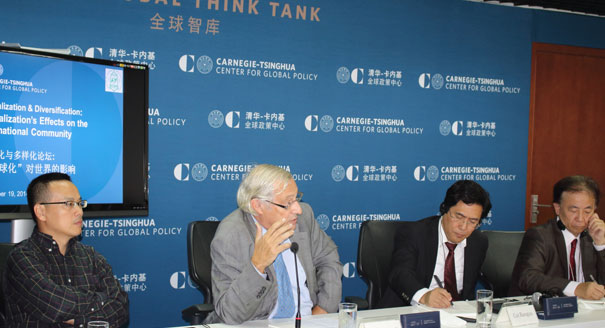 The Carnegie–Tsinghua Center for Global Policy and the Tsinghua School of Journalism and Communications co-hosted a discussion on globalization featuring Bertrand Badie of Sciences Po, Cui Baoguo of Tsinghua University, Marie-Françoise Durand of Sciences Po, and Wataru Sawamura of Asahi Shimbun. The discussion was moderated by Carnegie–Tsinghua’s Chen Qi