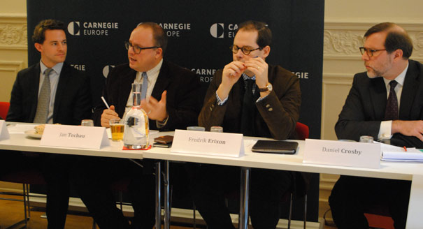 Carnegie Europe hosted a discussion on trade and energy governance. Panelists included Carnegie’s David Livingston, David Crosby of King & Spalding, and Fredrik Erixon of the European Centre for International Political Economy. Carnegie’s Jan Techau moderated. The discussion included representatives from governments, civil society, industry, and relevant international institutions and was held under Chatham House rules.