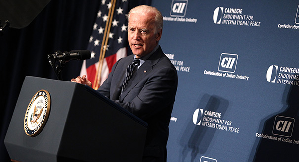 William J. Burns, president of the Carnegie Endowment for International Peace, and Chandrajit Banerjee, director general of the Confederation of Indian Industry, hosted a private dinner to celebrate U.S.-India relations on the tenth anniversary of the civil nuclear agreement. Remarks were given by the Vice President of the United States, the Honorable Joseph Robinette Biden, Jr.