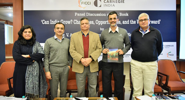 Carnegie India hosted the launch of Dr. V Anantha Nageswaran and Gulzar Natarajan’s new report “Can India Grow? Challenges, Opportunities and the Way Forward”. This was followed by a discussion on India’s growth prospects with V Anantha Nageswaran, journalist TCA Srinivas Raghavan, and Siddharth Singh, editor-at-large at Open Magazine. The conversation was moderated by Shivnath Thukral, managing director at Carnegie India.