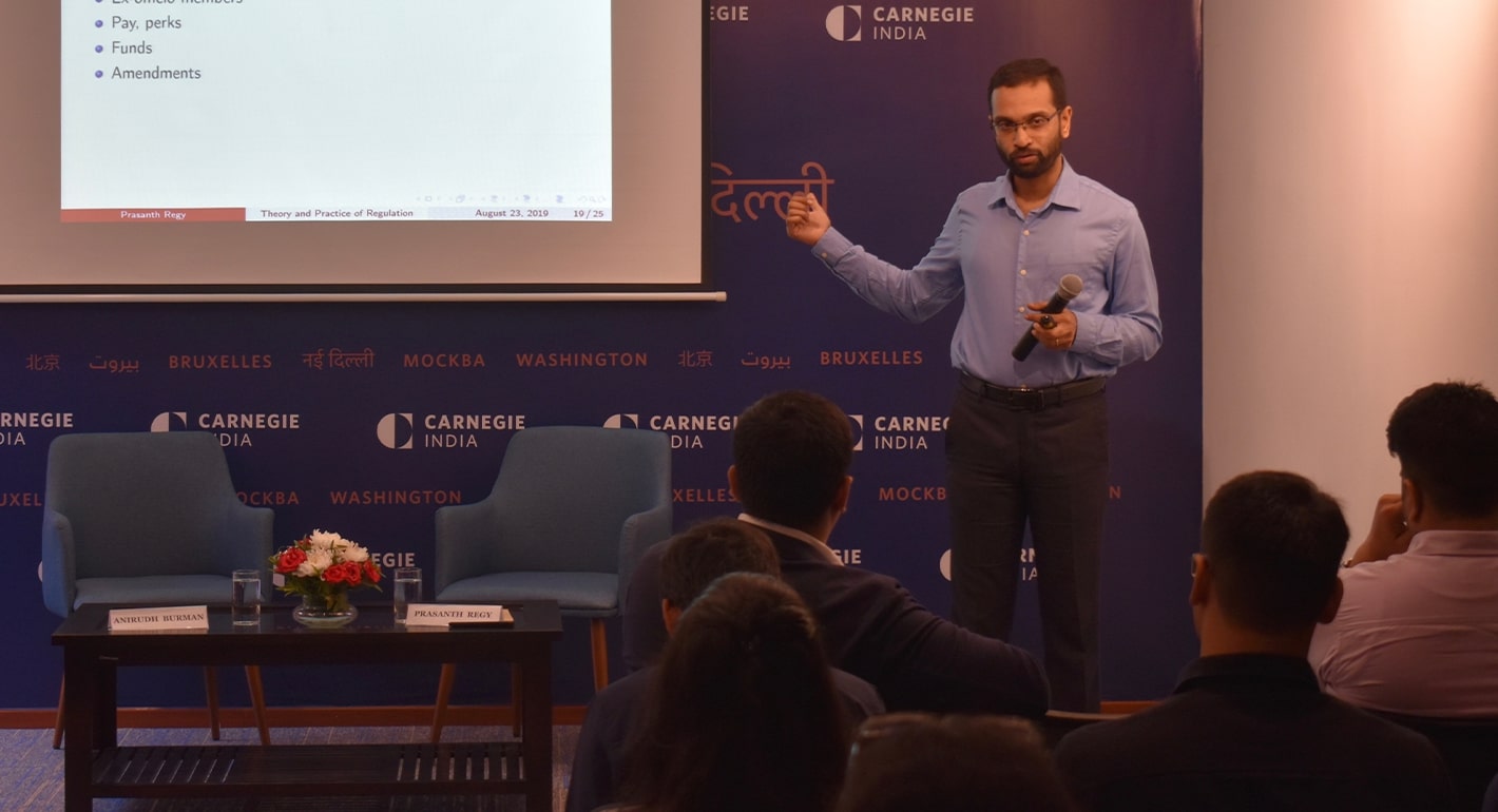 Carnegie India hosted a KnowledgeTransfer@CarnegieIndia workshop to examine the regulatory landscape in India with Prasant Regy, a senior fellow at the Rajiv Gandhi Institute for Contemporary Studies and Anirudh Burman, associate fellow at Carnegie India.