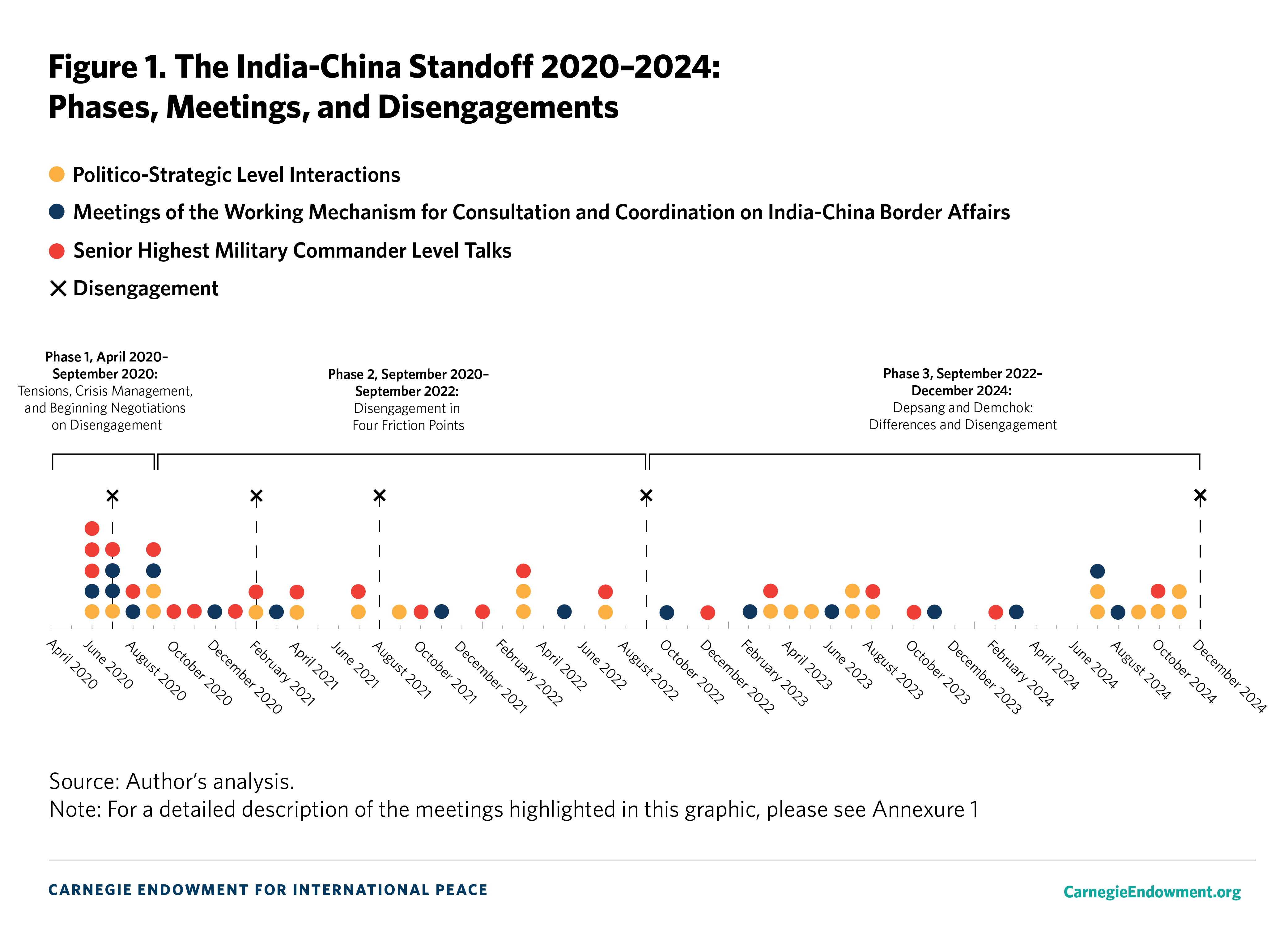 Phase 3, September 2022–December 2024: Both sides adopted increasingly divergent and hardened postures on the standoff from September 2022 until mid-2024 and disagreed on the way forward for the standoff and the bilateral relationship. This situation changed between July and December 2024, with both sides coming to an agreement in October on patrolling in Depsang and Demchok. In December, it was announced that disengagement had been “achieved in full,” and broader bilateral exchanges were being discussed.34