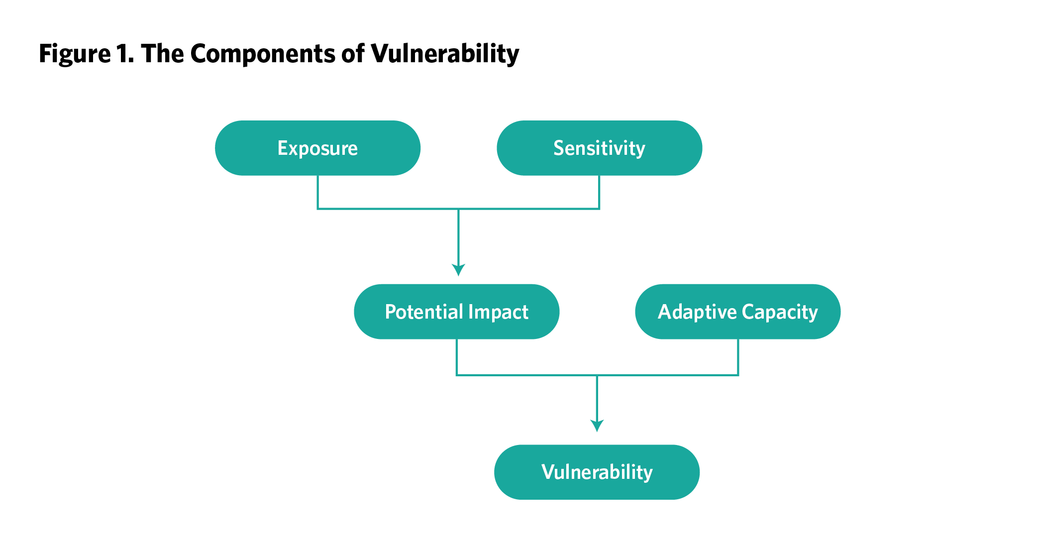 The Economic and Social Council for West Asia (ESCWA) has adopted the definition for vulnerability put forth by the Intergovernmental Panel on Climate Change (IPCC)’s Fourth Assessment Report, which breaks down the three primary components of vulnerability: exposure, sensitivity, and adaptive capacity, as shown in figure 1 below.