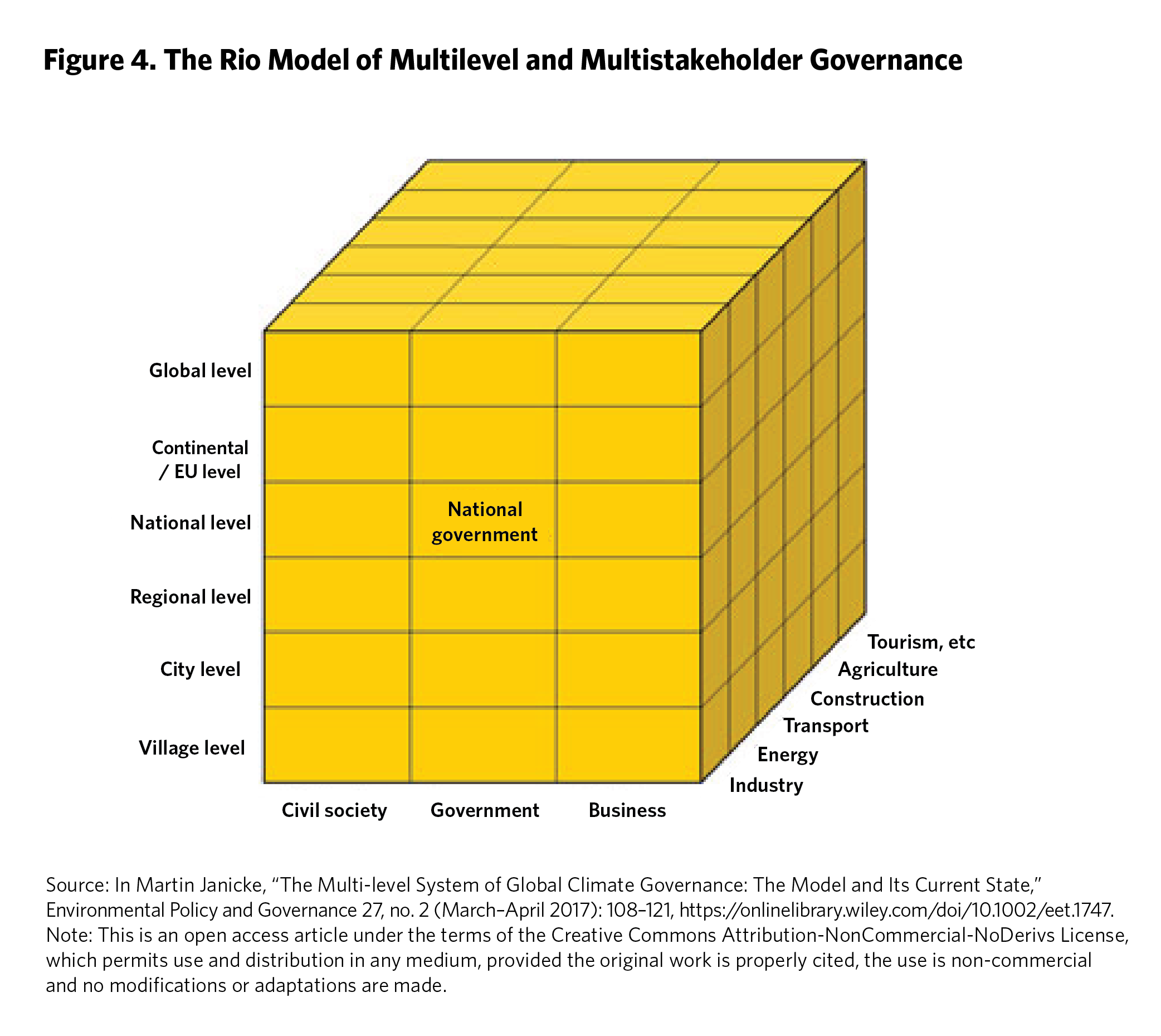 During the historic 1992 United Nations summit in Rio de Janeiro (known as the first Earth Summit), a multilevel global governance framework was introduced to start mobilizing actors toward sustainable development. Building on this concept, a multilevel climate governance has emerged as a system that “creates opportunities for action and interaction” among all stakeholders and at all levels of governance around climate action. It is meant to be regarded as an “opportunity structure,” rather than a “problem-oriented formulation,” as global climate policy is commonly perceived. Its key characteristic is that it is not restricted to governments but also includes diverse actors across all levels and sectors (as shown in figure 4).
