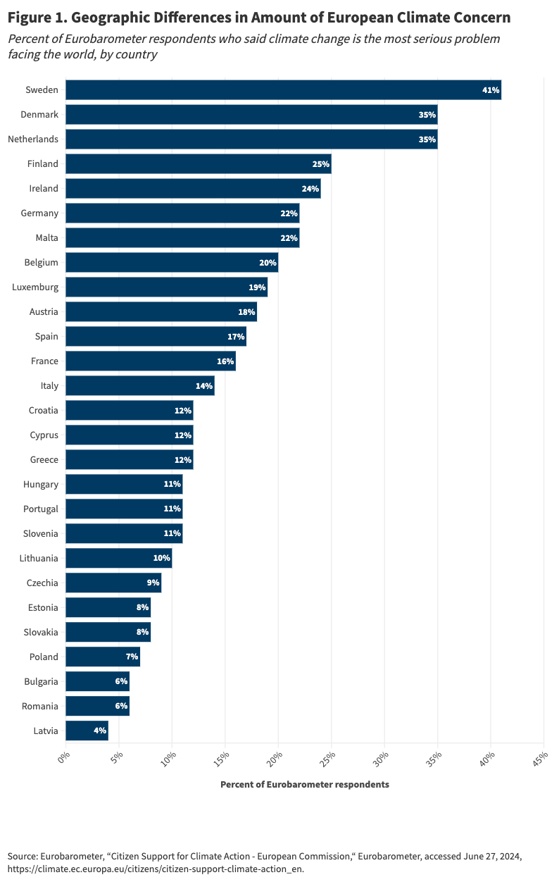 While such trends have been observed across the continent, Europe is not monolithic. There remain significant geographic variations in concern for the climate: For example, 41 percent of Eurobarometer respondents in Sweden and 35 percent in Denmark and the Netherlands deemed climate change the most serious problem facing the world, while only 4 percent of respondents in Latvia and 6 percent of respondents in Bulgaria and Romania said the same.16 The diversity of these responses indicates that although climate change has come to dominate debate in certain policy circles, especially at the EU level and in urban centers, urgent climate concern is not shared by all EU citizens.