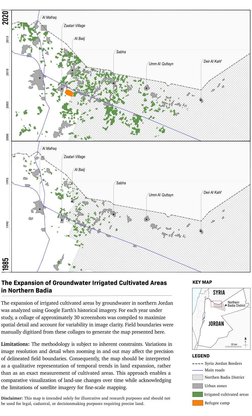 The remote desert region offers an instructive illustration of how overlapping economic, environmental, and climate-related factors are reshaping Northern Badia’s socioeconomic landscape. The settlement of Bedouins, those of Deir al-Kahf included, was central to the formation of the Jordanian state and its northern and eastern borders. From the Mandate period (1921–1946) until Jordan’s independence, and especially after 1970, this process reshaped local economies when the state greatly expanded its hiring among the population and encouraged agricultural development projects that encompassed the semi-arid steppes east of the Hijaz railway.