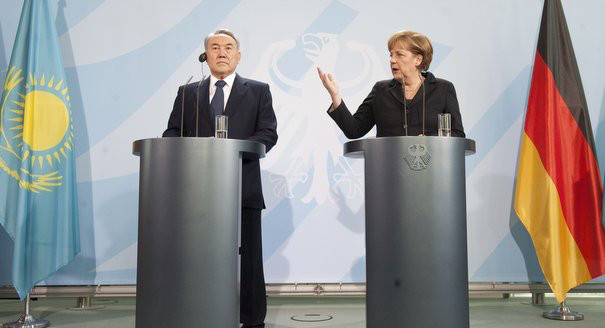 Only last December, Kazakhstan’s riot police killed 17 oil industry workers during a strike. Human rights activists have demanded an investigation. Mrs. Merkel said she raised the issue with Mr. Nazarbayev during his visit to Berlin last week. Mr. Nazarbayev rejected any criticism of his human rights record.