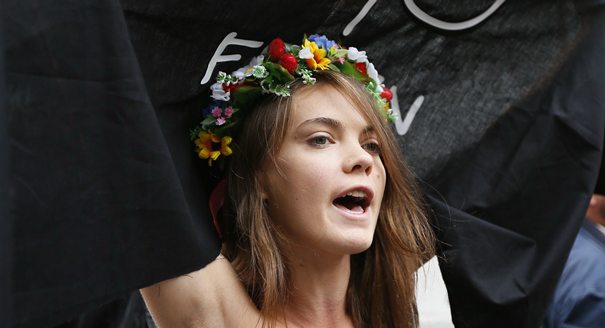 Their method is described as “sextremism.” And, as a FEMEN leader Inna Shevchenko explains in “How to become a FEMEN Sextremist. Lesson one,” it is based on principles of dominance and assertiveness. Shevchenko’s ground rules: “Rule one: Your pose has to be aggressive. Legs are straight open. Keep your arms up. We aren’t trying to attract anyone. We’re trying to make them scared. Rule two: never hide your face. Keep your poster above your head. Rule three: don’t smile. Scream. Protect women’s rights; fight dictatorship, patriarchy, sex industry.”
