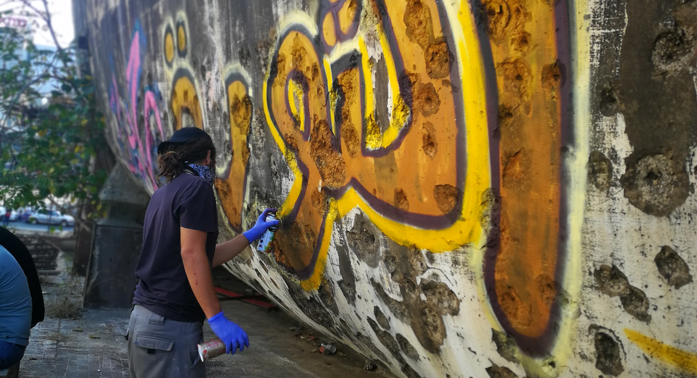 A young street artist is tagging the word thawra (revolution) on the egg-shaped movie theater in downtown Beirut. This massive, dilapidated structure dates back to 1965 and represents a scar of the civil war (1975¬–1990). Photo by Dalia Ghanem.