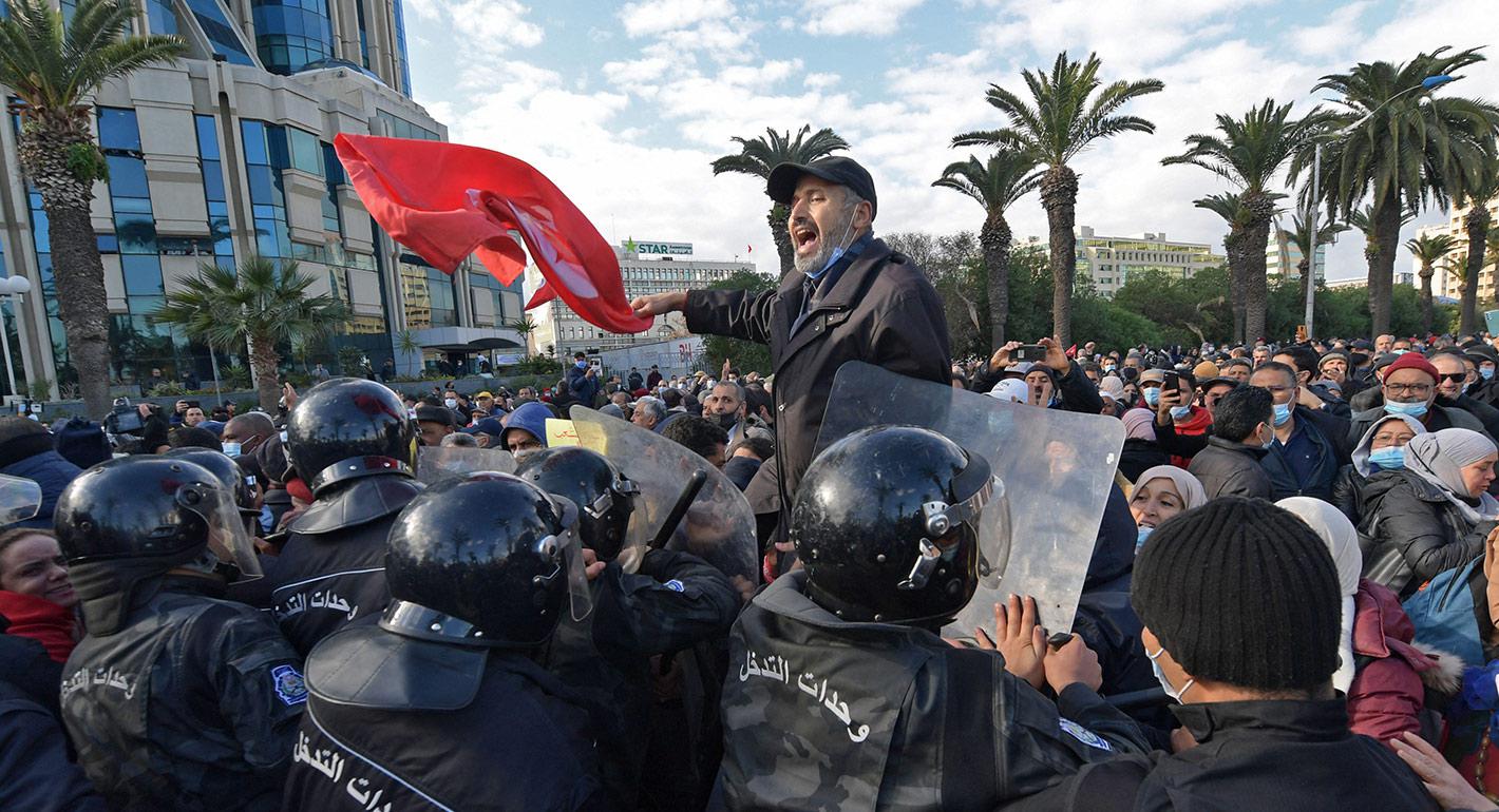 More than 1,000 protesters marched in Central Tunis on the date that had commemorated the revolution and Ben Ali’s departure—before Saied changed the anniversary to December 17, the day of Mohamed Bouaziz’s self-immolation. Protesters were met with police using water cannons and batons.
