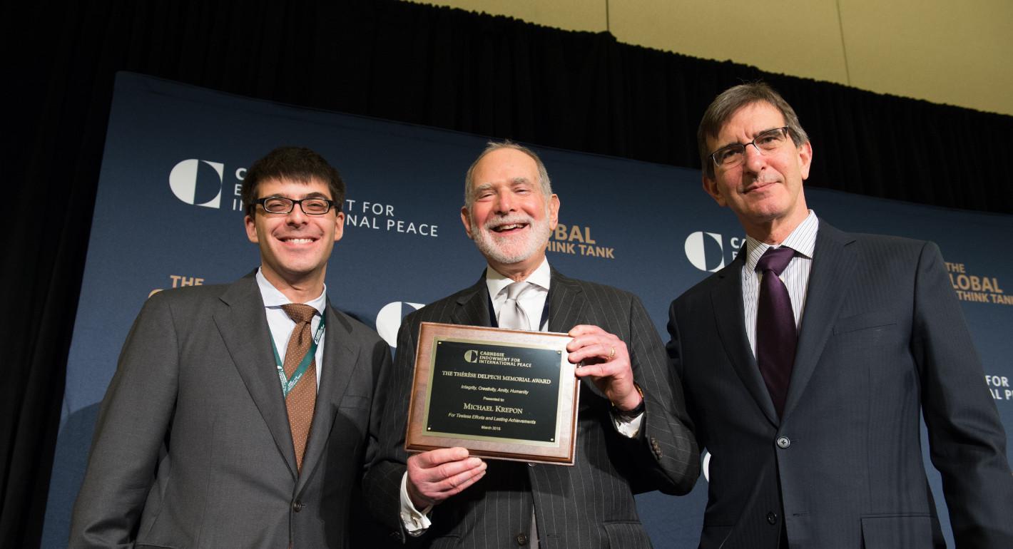 In March 2015, the Carnegie Endowment awarded Michael Krepon the Thérèse Delpech Memorial Award for exceptional service to the nuclear policy community. The award commendation cites Michael’s “tireless efforts and lasting achievements” to make the world a safer place—efforts that Michael described in his acceptance remarks as his “meaningful work.” He exhorted the nuclear policy community to continue its pursuit through the inevitable challenges to come.
