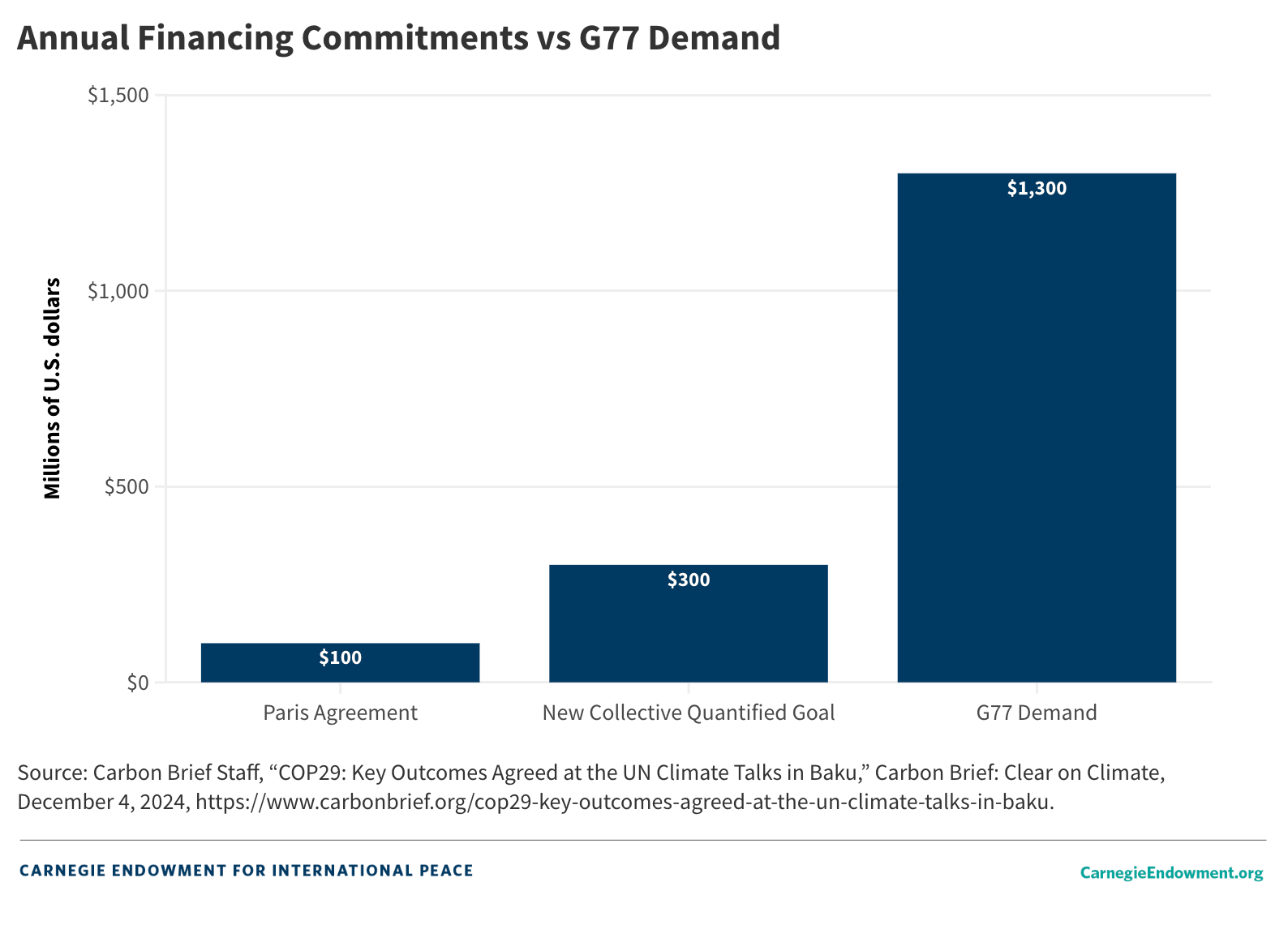 Discussions were narrowly focused on the size of funding commitments—or the “quantum,” as negotiators like to say. The G77 and China started this COP by demanding $1.3 trillion each year to address the needs of climate mitigation, adaptation, and loss and damages. Donor countries balked at this number, instead suggesting $250 billion per year by 2035. The hotly contested, final agreement set at least $300 billion per year by 2035 from developed countries and calls on “all actors” to work together to scale up the financing to developing countries to $1.3 trillion by 2035.