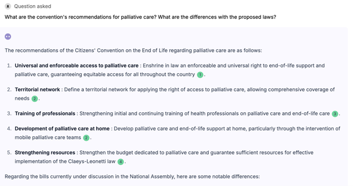 National Scale Applications. This kind of scale and inclusivity is not limited to local planning. In France, the national Citizens’ Convention on the End of Life used AI to help the broader public understand and engage with its findings. Through a chat interface, citizens could ask questions like “What are the convention’s recommendations for palliative care?” and receive plain-language, contextual answers. The platform offered a glimpse of how AI might open up the policy cycle itself, making complex deliberative processes legible and accessible to the public.