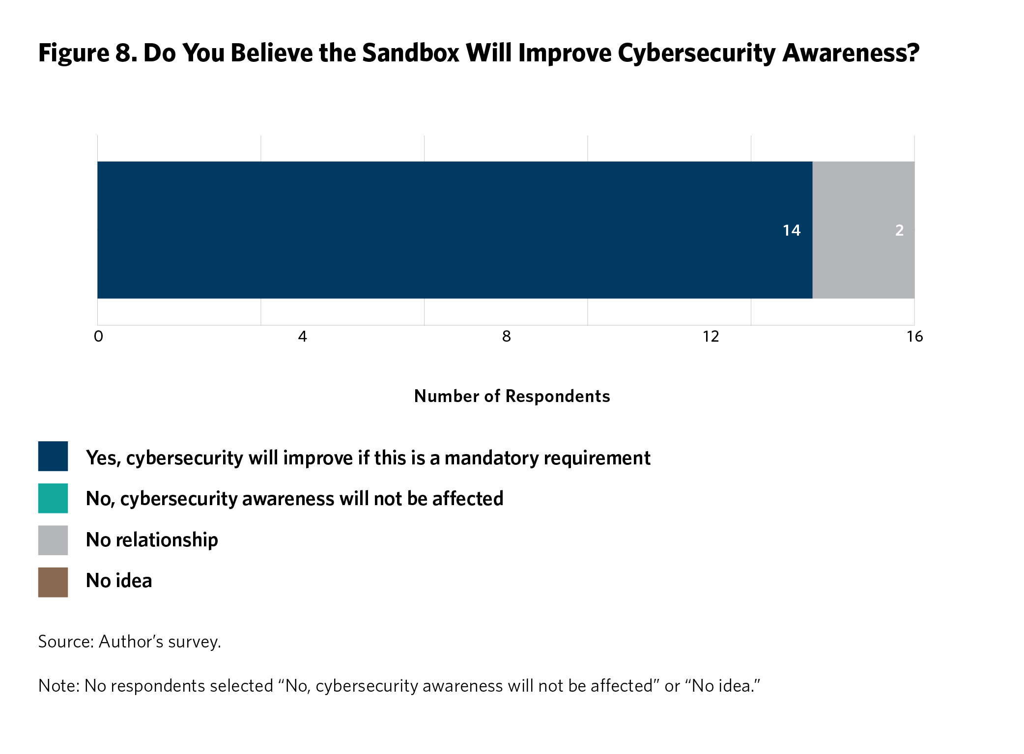 Respondents were asked whether they thought the regulatory sandboxes could be used to improve cybersecurity awareness among consumers of fintech products. As shown in figure 8, 87 percent believed this was possible only if the RBZ insisted on cybersecurity awareness before launching fintech solutions, and 13 percent saw no relationship between cybersecurity and the regulatory sandbox. Respondents were offered the option to select an answer saying that the sandbox would not affect cybersecurity awareness, but no respondents chose that answer.