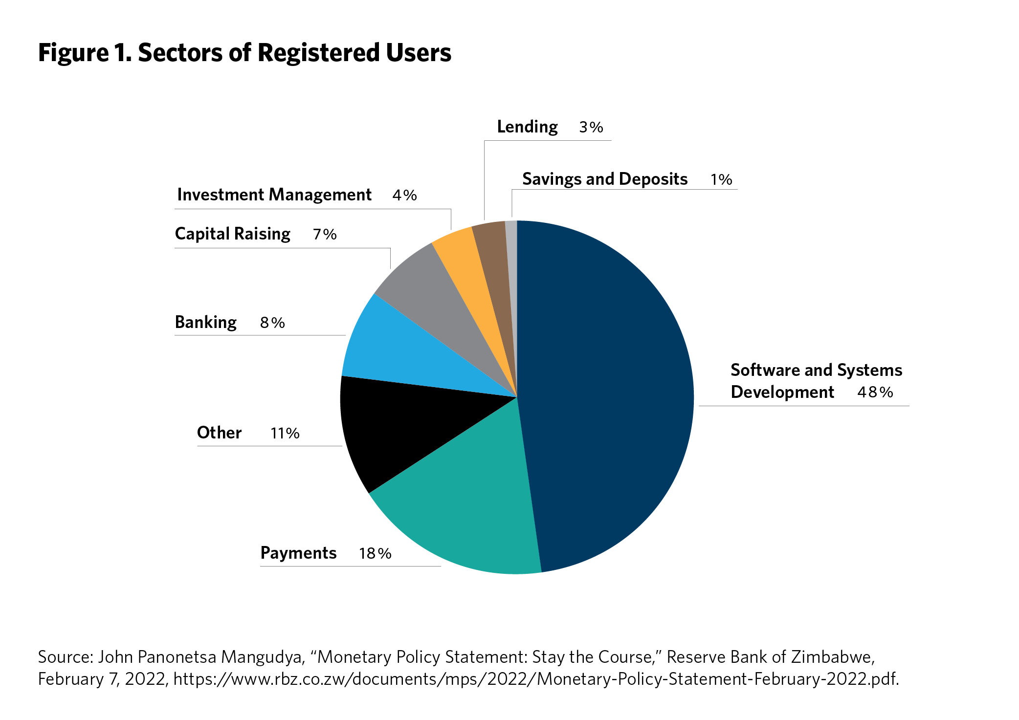 The RBZ advised that as of December 2021, the sandbox had received 112 registrations on the online portal and a further thirty-one applications at various stages.13 As shown in figure 1, registered users came from various sectors, with the largest groups coming from financial services software development (48 percent), payments (18 percent), capital raising (7 percent), and investment management (4 percent).14
