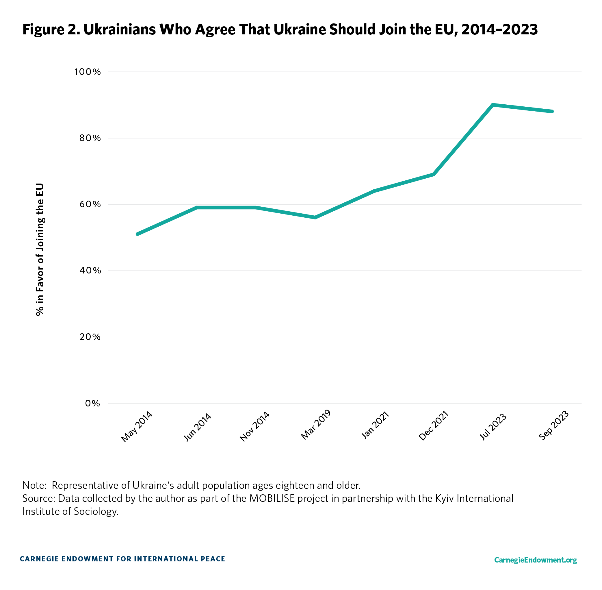 Some observers have argued that popular support for EU accession was not there in Ukraine in the same way it was in, say, Poland. Indeed, backing for Ukraine’s EU membership was slow to rise—potentially because of a perception that Ukraine’s accession was a highly unlikely prospect, and not least as a result of the EU’s hesitancy and existing members’ accession fatigue.