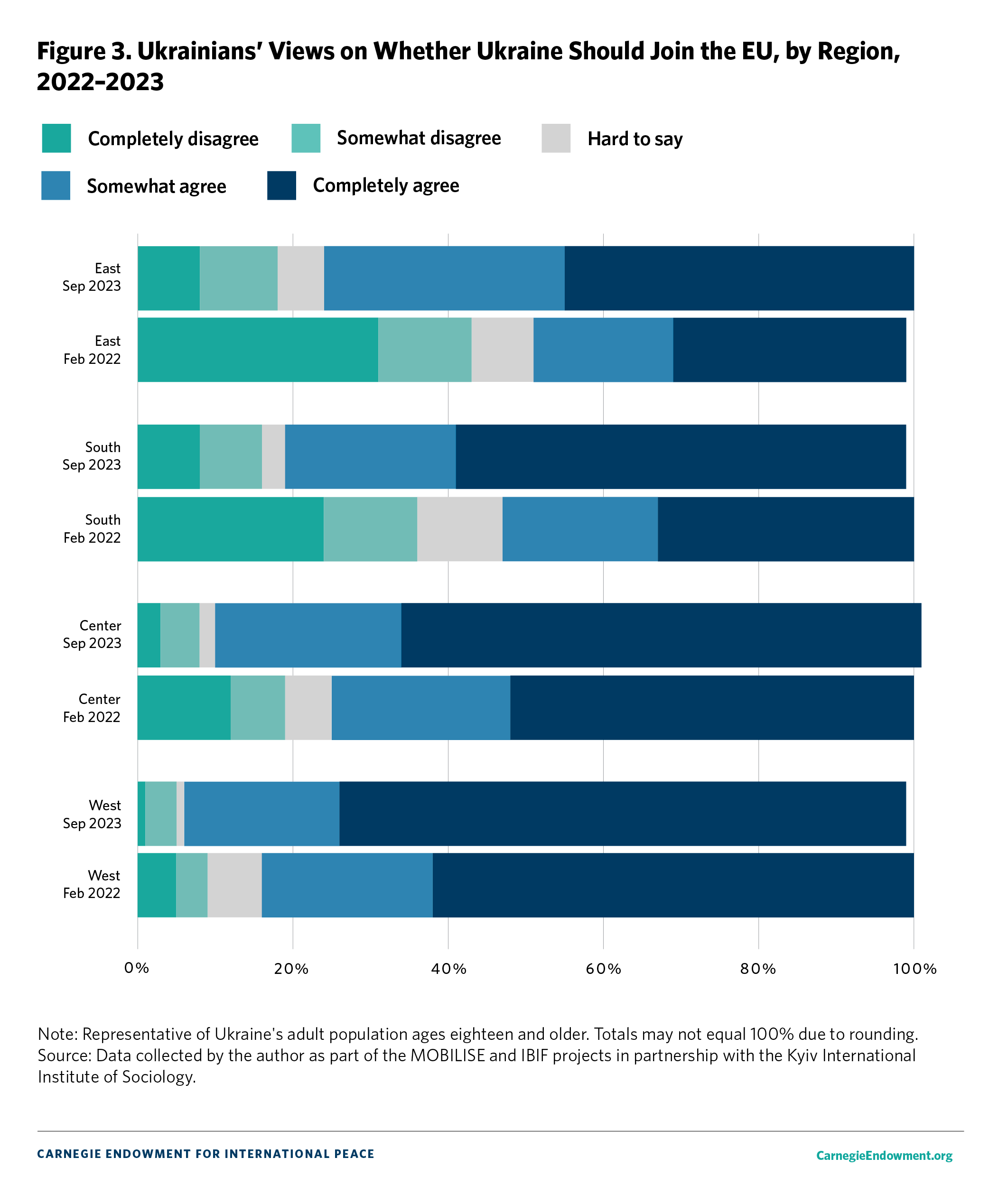 Ukrainians’ aspiration of EU membership is starkly evident in the context of the ongoing war. An August 2023 survey revealed an extraordinary consensus among the Ukrainian population, 90 percent of whom favored EU membership. What is interesting is that support for membership increased across all regions of Ukraine (see figure 3). After about a year and a half of Russia’s all-out war, there was a 25 percentage point increase in support for EU accession among Ukrainians living in the south of the country and a 28 point rise among those in the east.